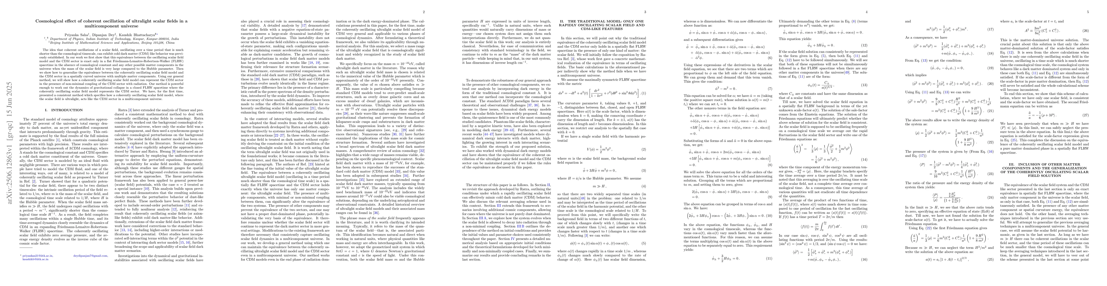 The idea that coherent oscillations of a scalar field, oscillating over a time period that is much shorter than the cosmological timescale, can exhibit cold dark matter (CDM) like behavior was previously established. In our work we first show that this equivalence between the oscillating scalar field model and the CDM sector is exact only in a flat Friedmann-Lemaitre-Robertson-Walker (FLRW) spacetime in the absence of cosmological constant and any other possible matter components in the universe when the mass of the scalar field is very large compared to the Hubble parameter. Then we show how to generalize the equivalence between the coherently oscillating scalar field model and the CDM sector in a spatially curved universe with multiple matter components. Using our general method, we will show how a coherently oscillating scalar field model can represent the CDM sector in the presence of non-minimal coupling of the CDM sector with radiation. Our method is powerful enough to work out the dynamics of gravitational collapse in a closed FLRW spacetime where the coherently oscillating scalar field model represents the CDM sector. We have, for the first time, presented a consistent method which specifies how a coherently oscillating scalar field model, where the scalar field is ultralight, acts like the CDM sector in a multicomponent universe.