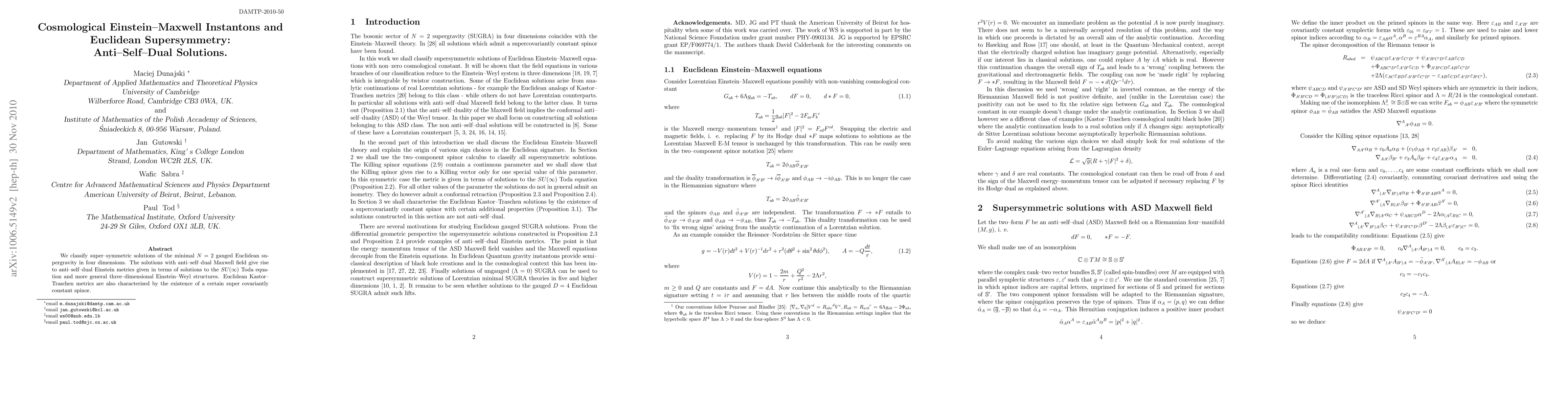 This paper classifies supersymmetric solutions of $N=2$ gauged Euclidean supergravity, focusing on anti-self-dual Maxwell field solutions that yield anti-self-dual Einstein metrics linked to $SU(\infty)$ Toda equations and three-dimensional Einstein-Weyl structures. It also characterizes Euclidean Kastor-Traschen metrics via super covariantly constant spinors.