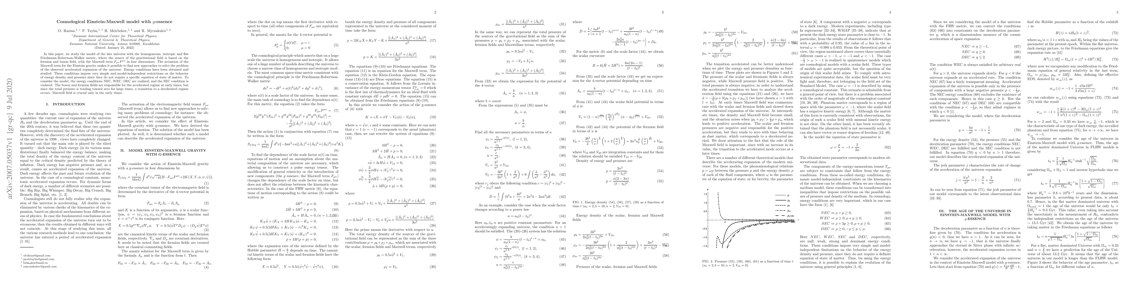 In this paper, we study the model of the late universe with the homogeneous, isotropic and flat Friedmann-Robertson-Walker metric, where the source of the gravitational field is based on the fermion and boson field, with the Maxwell term $F_{\mu\nu}F^{\mu\nu} $ in four dimensions. The actuation of the Maxwell term for the Einstein gravity makes it possible to find new approaches to solve the problem of the observed accelerated expansion of the universe. Energy conditions have been obtained and studied. These conditions impose very simple and model-independent restrictions on the behaviour of energy density and pressure since they do not require a specific equation of state of matter. To consider the model, the energy conditions NEC, WEC, DEC are realized, and the SEC condition is violated. The boson and fermion fields are responsible for the accelerated regime at early times, but since the total pressure is tending toward zero for large times, a transition to a decelerated regime occurs. Maxwell field is crucial only in the early times.