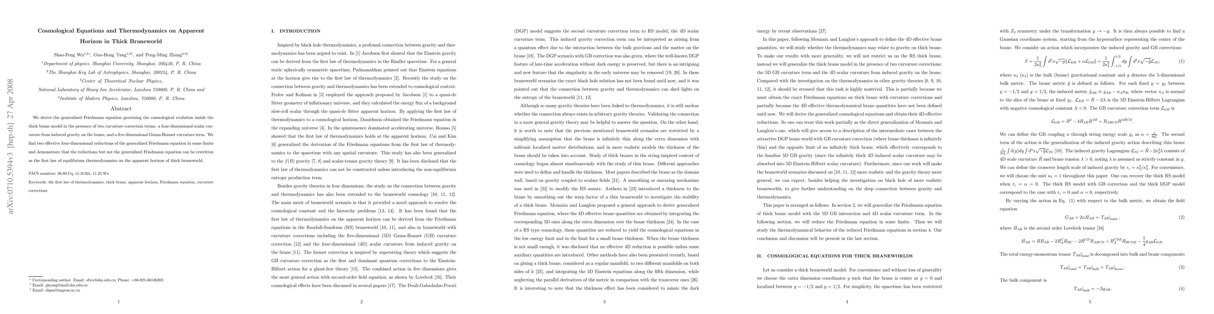 This paper derives the generalized Friedmann equation for a thick braneworld model, incorporating curvature corrections from induced gravity and Gauss-Bonnet terms. It shows that under certain limits, the Friedmann equation can be reformulated as the first law of thermodynamics on the apparent horizon.