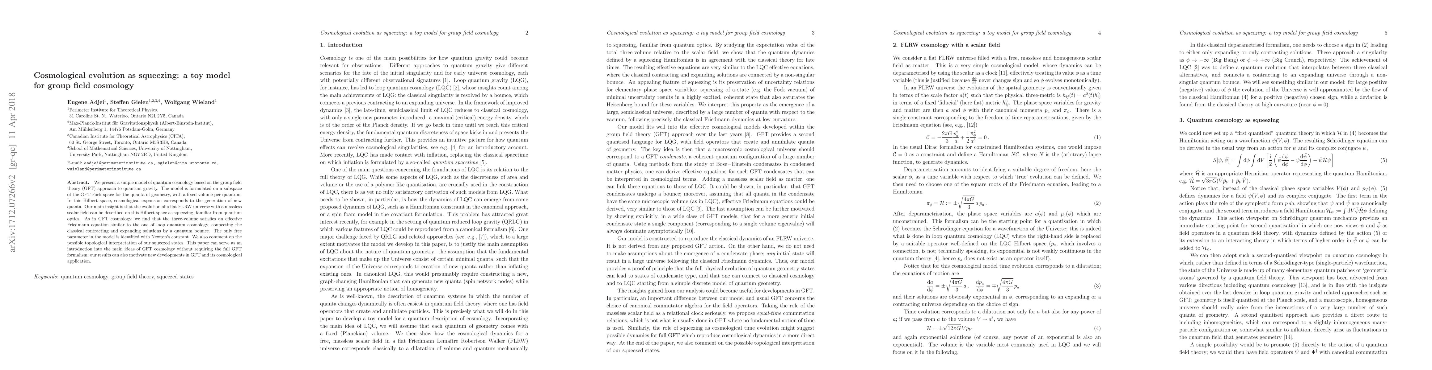 This paper introduces a simplified quantum cosmology model using group field theory (GFT) to describe cosmological evolution as squeezing, akin to quantum optics. The model connects classical contracting and expanding universe solutions via a quantum bounce, similar to loop quantum cosmology, and identifies Newton's constant as the sole free parameter.