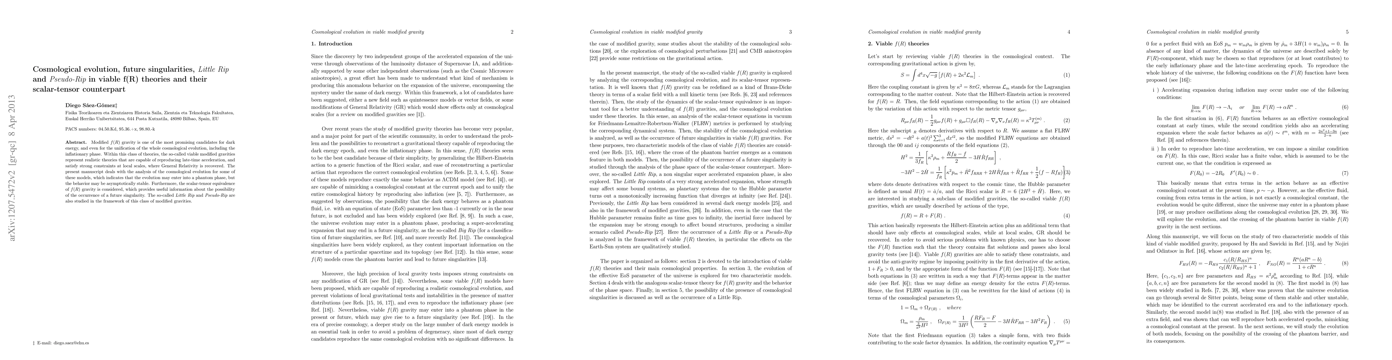 Modified f(R) gravity is one of the most promising candidates for dark energy, and even for the unification of the whole cosmological evolution, including the inflationary phase. Within this class of theories, the so-called viable modified gravities represent realistic theories that are capable of reproducing late-time acceleration, and satisfy strong constraints at local scales, where General Relativity is recovered. The present manuscript deals with the analysis of the cosmological evolution for some of these models, which indicates that the evolution may enter into a phantom phase, but the behavior may be asymptotically stable. Furthermore, the scalar-tensor equivalence of f(R) gravity is considered, which provides useful information about the possibility of the occurrence of a future singularity. The so-called Little Rip and Pseudo-Rip are also studied in the framework of this class of modified gravities.