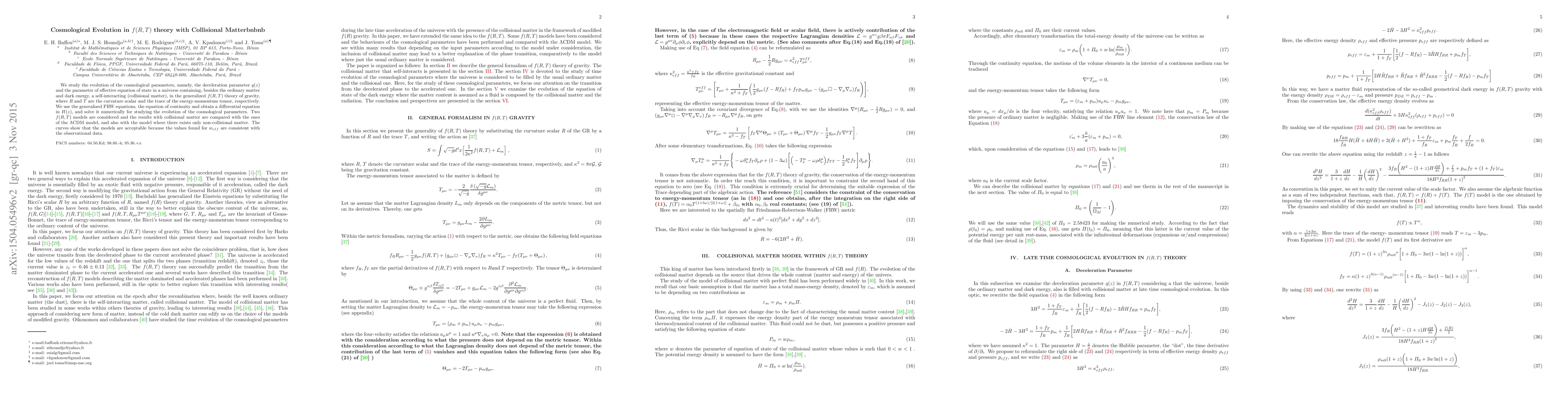 We study the evolution of the cosmological parameters, namely, the deceleration parameter $q(z)$ and the parameter of effective equation of state in a universe contains, besides the ordinary matter and dark energy, a self-interacting (collisional matter), in the generalized $f(R,T)$ theory of gravity, where $R$ and $T$ are the curvature scalar and the trace of the energy-momentum tensor, respectively. We use the generalized FRW equations the equation of continuity and obtain a differential equation of second order in $H(z)$, and solve it numerically for studying the evolution of the cosmological parameters. Two $f(R,T)$ models are considered and the results with collisional matter are compared with the ones of the $\Lambda$CDM model, and also with the model where there exists only non-collisional matter. The curves show that the models are acceptable because the values found for $w_{eff}$ are consistent with the observational data.