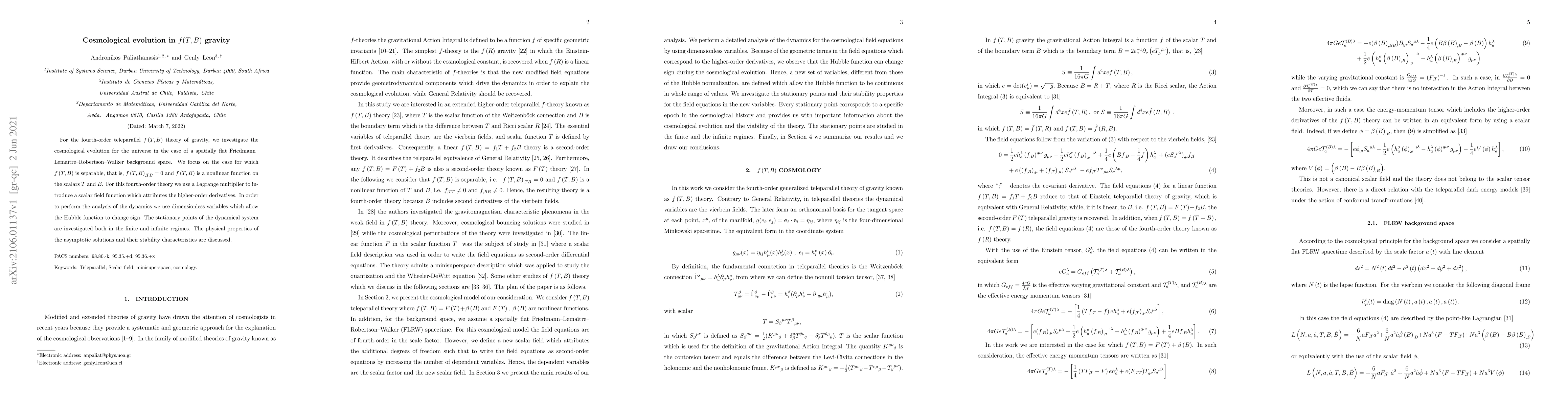 For the fourth-order teleparallel $f\left(T,B\right) $ theory of gravity, we investigate the cosmological evolution for the universe in the case of a spatially flat Friedmann--Lema\^{\i}tre--Robertson--Walker background space. We focus on the case for which $f\left(T,B\right) $ is separable, that is, $f\left(T,B\right) _{,TB}=0$ and $f\left(T,B\right) $ is a nonlinear function on the scalars $T$ and $B$. For this fourth-order theory we use a Lagrange multiplier to introduce a scalar field function which attributes the higher-order derivatives. In order to perform the analysis of the dynamics we use dimensionless variables which allow the Hubble function to change sign. The stationary points of the dynamical system are investigated both in the finite and infinite regimes. The physical properties of the asymptotic solutions and their stability characteristics are discussed.