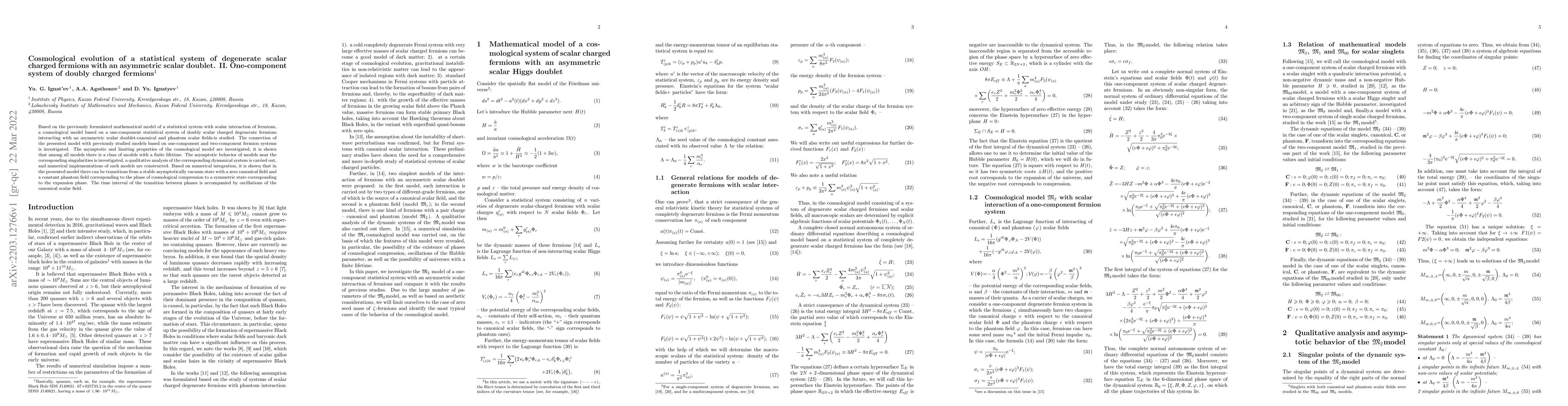 Based on the previously formulated mathematical model of a statistical system with scalar interaction of fermions, a cosmological model based on a one-component statistical system of doubly scalar charged degenerate fermions interacting with an asymmetric scalar doublet-canonical and phantom scalar fields-is studied. The connection of the presented model with previously studied models based on one-component and two-component fermion systems is investigated. The asymptotic and limiting properties of the cosmological model are investigated, it is shown that among all models there is a class of models with a finite lifetime. The asymptotic behavior of models near the corresponding singularities is investigated, a qualitative analysis of the corresponding dynamical system is carried out, and numerical implementations of such models are constructed. Based on numerical integration, it is shown that in the presented model there can be transitions from a stable asymptotically vacuum state with a zero canonical field and a constant phantom field corresponding to the phase of cosmological compression to a symmetric state corresponding to the expansion phase. The time interval of the transition between phases is accompanied by oscillations of the canonical scalar field.