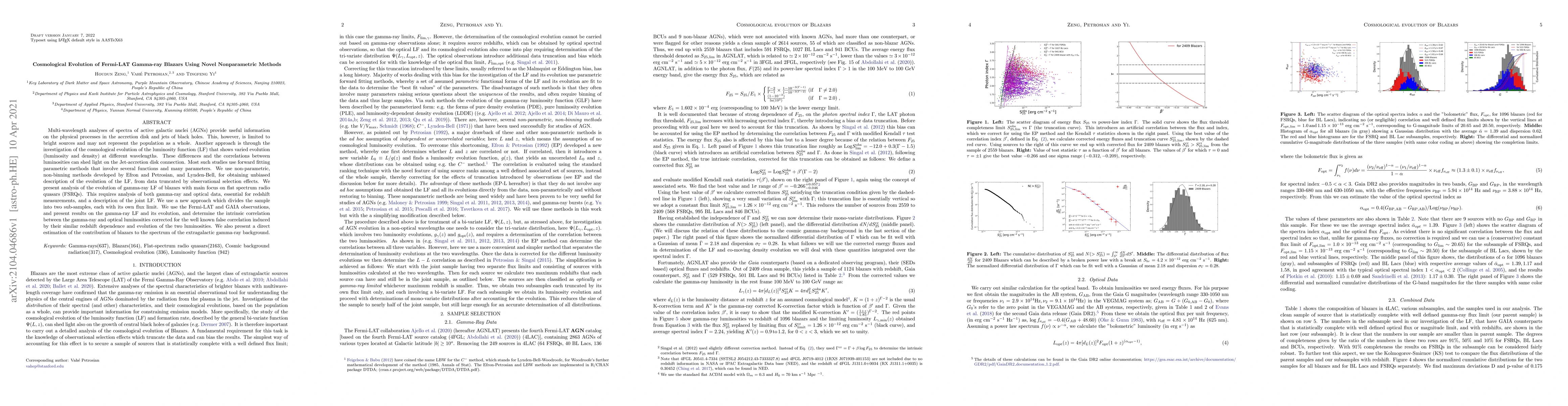 Multi-wavelength analyses of spectra of active galactic nuclei (AGNs) provide useful information on the physical processes in the accretion disk and jets of black holes. This, however, is limited to bright sources and may not represent the population as a whole. Another approach is through the investigation of the cosmological evolution of the luminosity function (LF) that shows varied evolution (luminosity and density) at different wavelengths. These differences and the correlations between luminosities can shed light on the Jet-accretion disk connection. Most such studies use forward fitting parametric methods that involve several functions and many parameters. We use non-parametric, non-binning methods developed by Efron and Petrosian, and Lynden-Bell, for obtaining unbiased description of the evolution of the LF, from data truncated by observational selection effects. We present analysis of the evolution of gamma-ray LF of blazars with main focus on flat spectrum radio quasars (FSRQs). This requires analysis of both gamma-ray and optical data, essential for redshift measurements, and a description of the joint LF. We use a new approach which divides the sample into two sub-samples, each with its own flux limit. We use the Fermi-LAT and GAIA observations, and present results on the gamma-ray LF and its evolution, and determine the intrinsic correlation between the gamma-ray and optical luminosities corrected for the well known false correlation induced by their similar redshift dependence and evolution of the two luminosities. We also present a direct estimation of the contribution of blazars to the spectrum of the extragalactic gamma-ray background.
