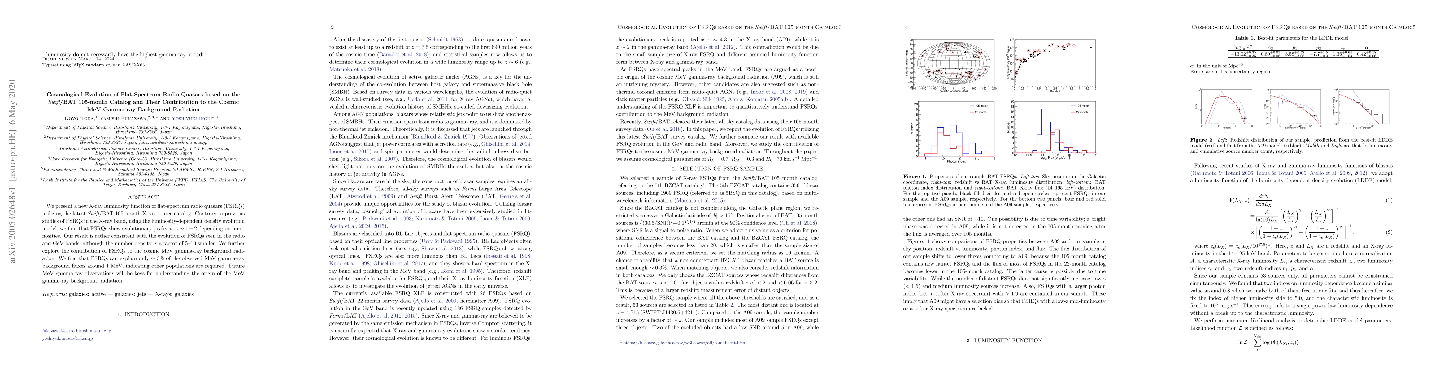 This paper presents a new X-ray luminosity function for flat-spectrum radio quasars (FSRQs) using the Swift/BAT 105-month catalog, revealing evolutionary peaks at $z\sim1-2$ based on luminosity. It also finds that FSRQs contribute only about 3% to the cosmic MeV gamma-ray background, suggesting other sources are needed to explain the observed MeV gamma-ray background.