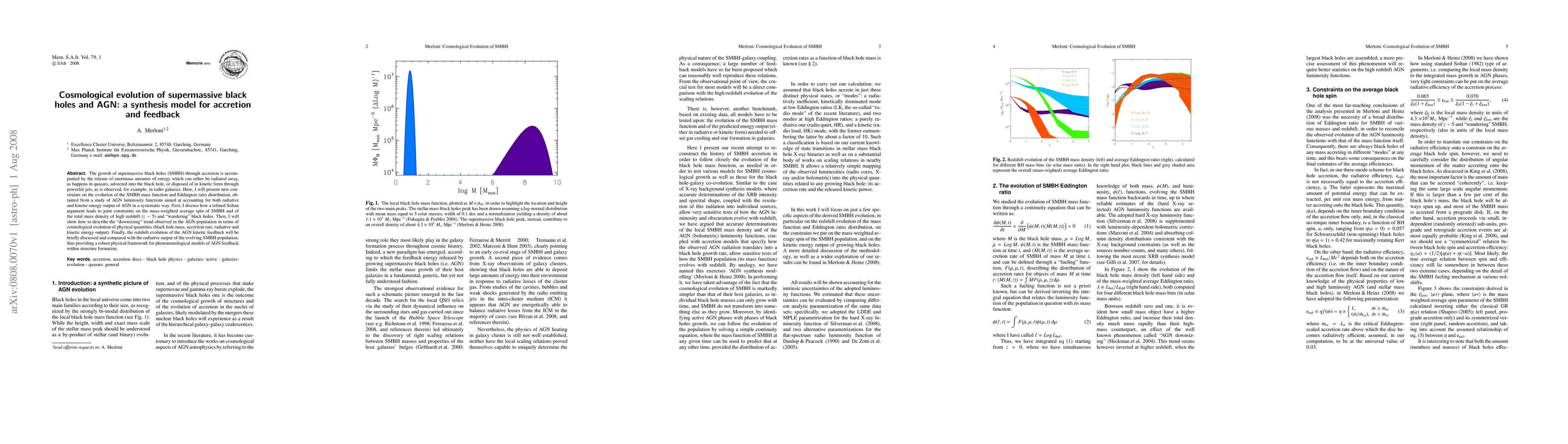This paper presents a synthesis model for the cosmological evolution of supermassive black holes (SMBH) and active galactic nuclei (AGN), integrating both radiative and kinetic energy outputs. It provides new constraints on the SMBH mass function and Eddington ratio distribution, and discusses the downsizing trend and the evolution of AGN kinetic feedback in the context of structure formation.