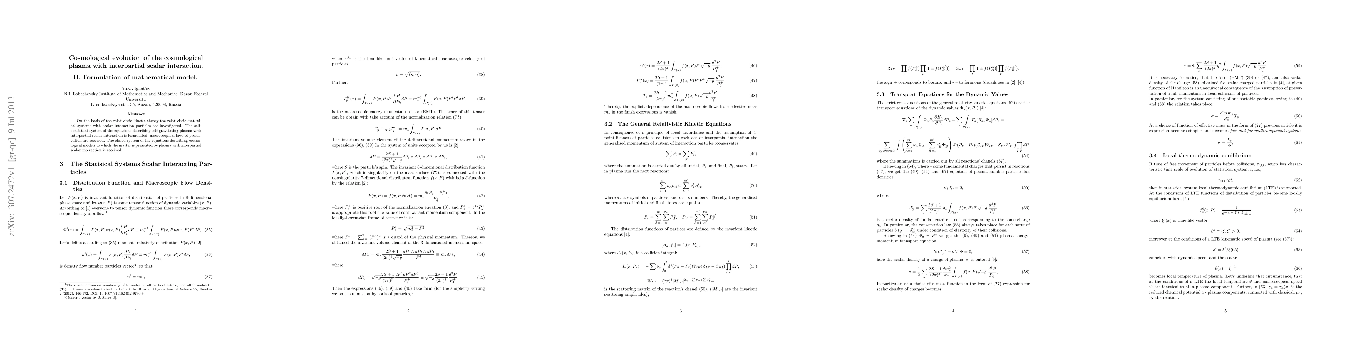 On the basis of the relativistic kinetic theory the relativistic statistical systems with scalar interaction particles are investigated. The self-consistent system of the equations describing self-gravitating plasma with interpartial scalar interaction is formulated, macroscopical laws of preservation are received. The closed system of the equations describing cosmological models to which the matter is presented by plasma with interpartial scalar interaction is received.