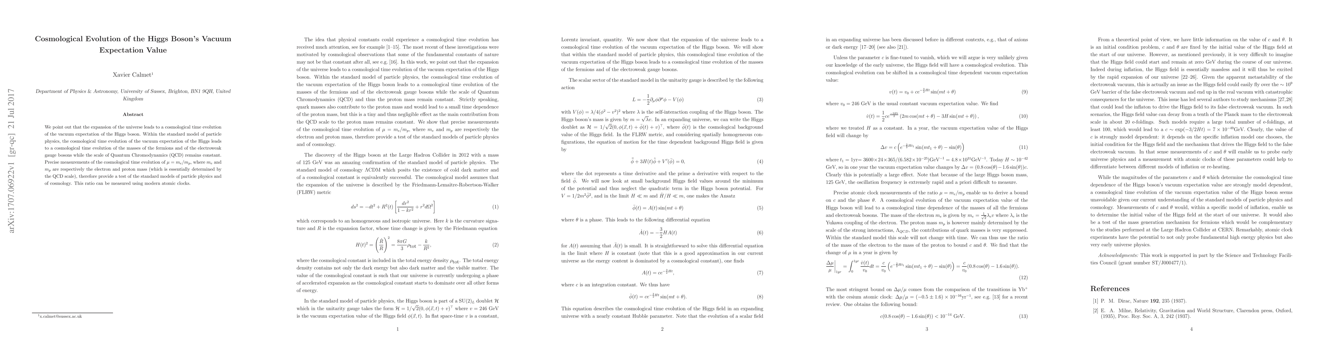 This paper explores the cosmological evolution of the Higgs boson's vacuum expectation value due to the universe's expansion, affecting fermion and electroweak gauge boson masses while keeping the QCD scale constant. It suggests that precise measurements of the ratio $\mu=m_e/m_p$ via modern atomic clocks can test the standard models of particle physics and cosmology.