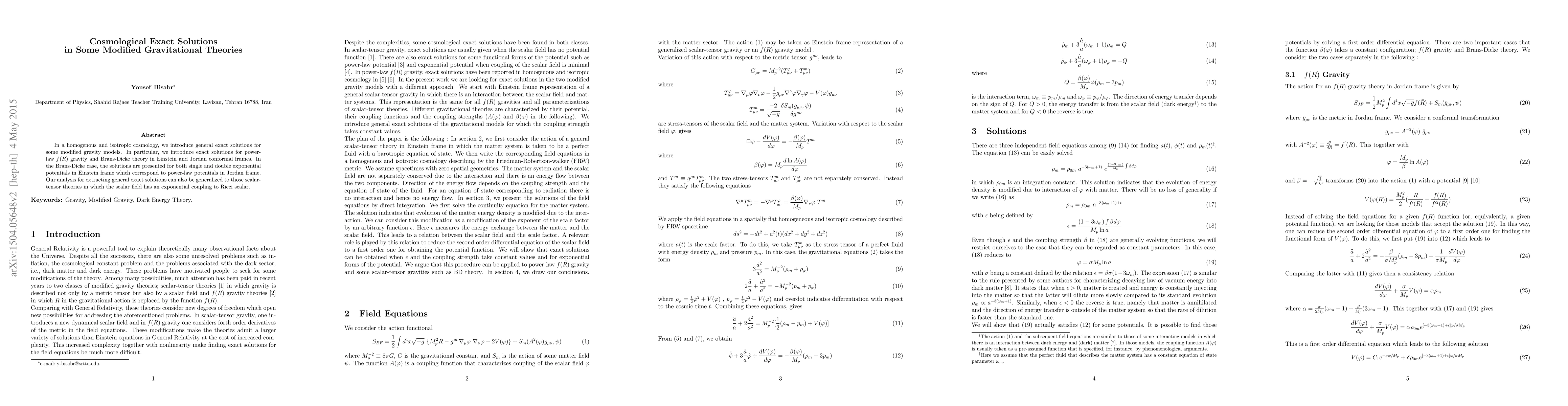 This paper presents general exact solutions for modified gravity models, specifically focusing on power-law $f(R)$ gravity and Brans-Dicke theory in both Einstein and Jordan conformal frames. It also explores solutions for Brans-Dicke theory with single and double exponential potentials in Einstein frame, corresponding to power-law potentials in Jordan frame.