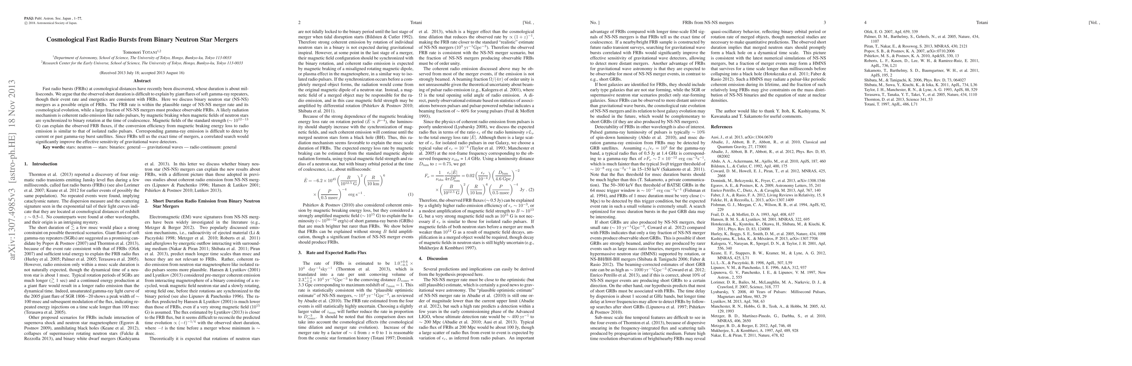 This paper proposes that fast radio bursts (FRBs) at cosmological distances may originate from binary neutron star mergers, aligning with their event rate and energetics. It suggests that coherent radio emission from magnetic braking during neutron star coalescence could explain the observed FRB fluxes.