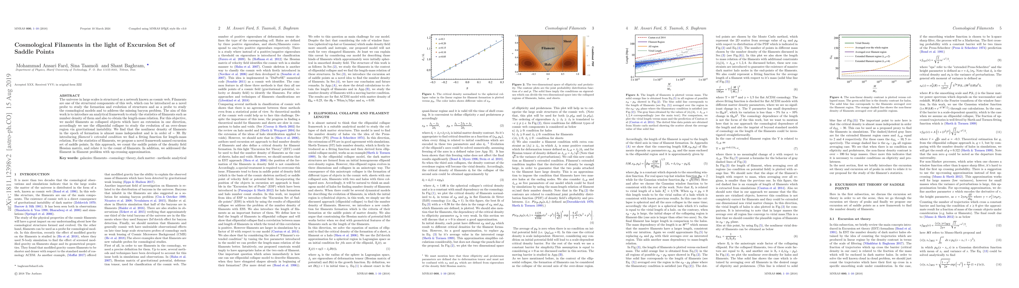 The universe in large scales is structured as a network known as cosmic web. Filaments are one of the structural components of this web, which can be introduced as a novel probe to study the formation and evolution of structures and as a probe to study the cosmological models and to address the missing baryon problem. The aim of this work is to introduce an analytical framework to study the statistics of filaments such as number density of them and also to obtain the length-mass relation. For this objective, we model filaments as collapsed objects which have an extension in one direction, accordingly we use the ellipsoidal collapse to study the evolution of an over-dense region via gravitational instability. %In this context, we consider the critical density of filament formation, which will be a crucial parameter for number density count. We find that the nonlinear density of filaments in the epoch of formation is almost mass independent and is in order of $\sim 30$. By introducing {\it{filament's extended condition}} we find a fitting function for length-mass relation. For the statistics of filaments, we propose a novel framework named excursion set of saddle points. In this approach, we count the saddle points of the density field Hessian matrix, and relate it to the count of filaments. In addition, we addressed the filament in filament problem with up-crossing approximation.