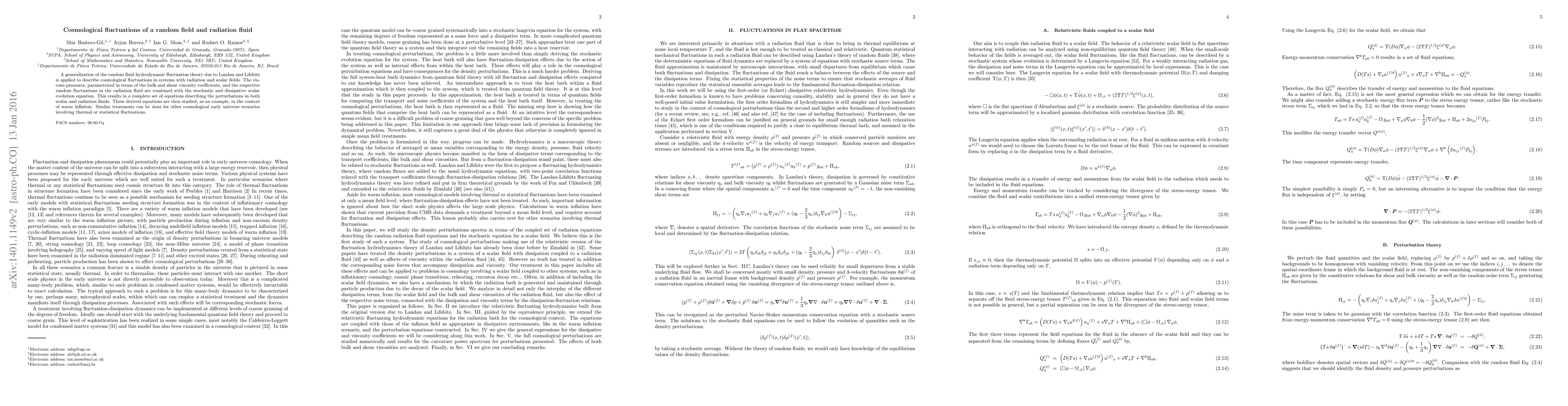 The research applies a generalization of Landau and Lifshitz's random fluid hydrodynamic fluctuation theory to describe cosmological fluctuations in systems with radiation and scalar fields, combining viscous pressures and their fluctuations with the stochastic and dissipative scalar evolution equation to derive a complete set of equations for perturbations in both scalar and radiation fluids. This framework is exemplified in the context of warm inflation but can be extended to other early universe scenarios.