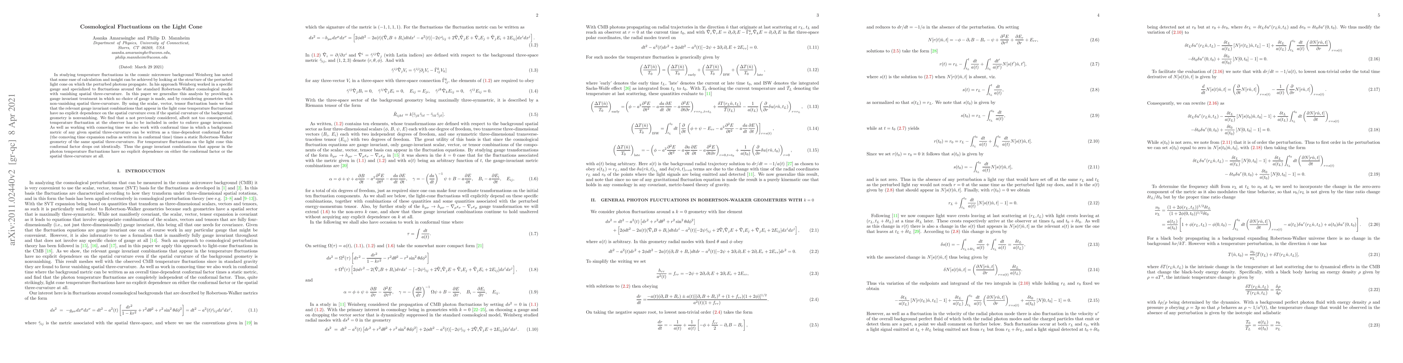 In studying temperature fluctuations in the cosmic microwave background Weinberg has noted that some ease of calculation and insight can be achieved by looking at the structure of the perturbed light cone on which the perturbed photons propagate. In his approach Weinberg worked in a specific gauge and specialized to fluctuations around the standard Robertson-Walker cosmological model with vanishing spatial three-curvature. In this paper we generalize this analysis by providing a gauge invariant treatment in which no choice of gauge is made, and by considering geometries with non-vanishing spatial three-curvature. By using the scalar, vector, tensor fluctuation basis we find that the relevant gauge invariant combinations that appear in the light cone temperature fluctuations have no explicit dependence on the spatial curvature even if the spatial curvature of the background geometry is nonvanishing. We find that a not previously considered, albeit not too consequential, temperature fluctuation at the observer has to be included in order to enforce gauge invariance. As well as working with comoving time we also work with conformal time in which a background metric of any given spatial three-curvature can be written as a time-dependent conformal factor (the comoving time expansion radius as written in conformal time) times a static Robertson-Walker geometry of the same spatial three-curvature. For temperature fluctuations on the light cone this conformal factor drops out identically. Thus the gauge invariant combinations that appear in the photon temperature fluctuations have no explicit dependence on either the conformal factor or the spatial three-curvature at all.