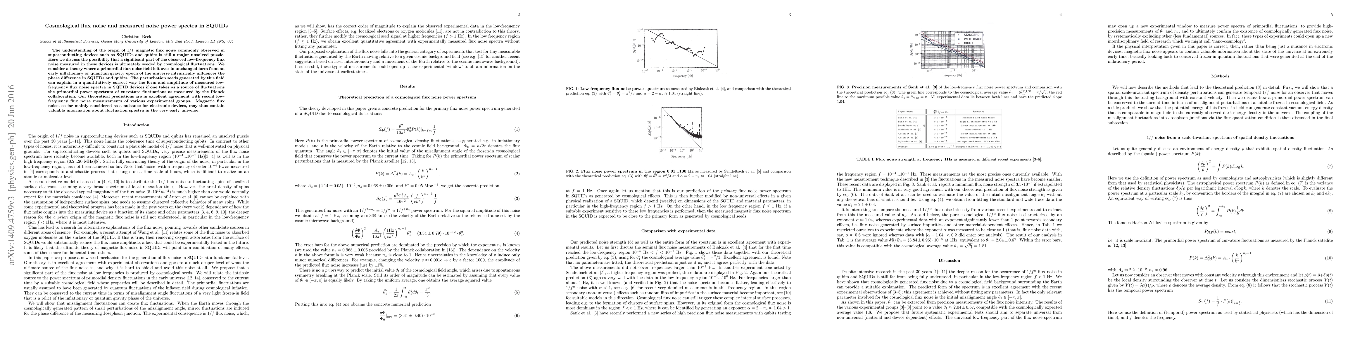 The understanding of the origin of $1/f$ magnetic flux noise commonly observed in superconducting devices such as SQUIDS and qubits is still a major unsolved puzzle. Here we discuss the possibility that a significant part of the observed low-frequency flux noise measured in these devices is ultimately seeded by cosmological fluctuations. We consider a theory where a primordial flux noise field left over in unchanged form from an early inflationary or quantum gravity epoch of the universe intrinsically influences the phase difference in SQUIDs and qubits. The perturbation seeds generated by this field can explain in a quantitatively correct way the form and amplitude of measured low-frequency flux noise spectra in SQUID devices if one takes as a source of fluctuations the primordial power spectrum of curvature fluctuations as measured by the Planck collaboration. Our model predicts flux noise with a spectrum given by an $1/f^{2-n_s}$ spectrum, where $n_s=0.96$ is the spectral index of the near-scale invariant primordial density fluctuations. For the typical amplitude of this cosmologically generated universal flux noise we theoretically calculate the average value $\delta \Phi /\Phi_0 =3.41 \cdot 10^{-6}$ at 1Hz. These theoretical predictions are in excellent agreement with recent low-frequency flux noise measurements of various experimental groups. Magnetic flux noise, so far mainly considered as a nuisance for electronic devices, may thus contain valuable information about fluctuation spectra in the very early universe.
