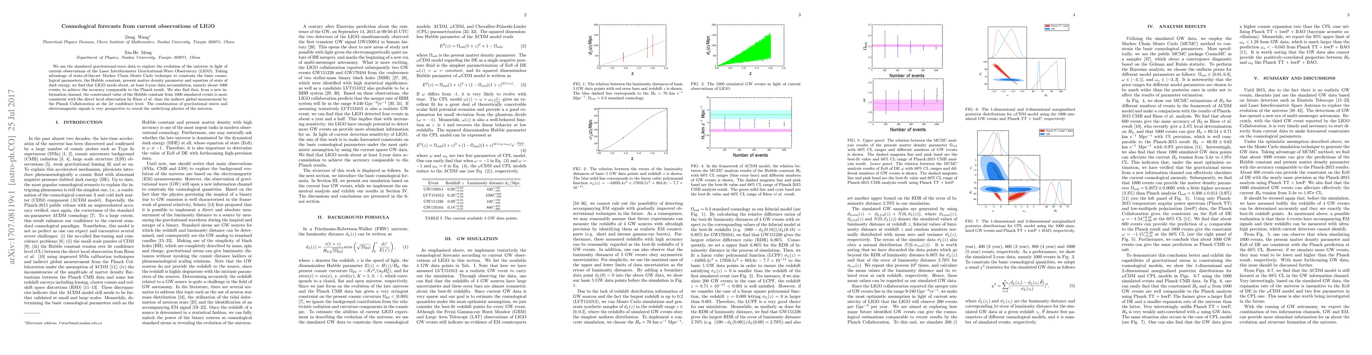 We use the simulated gravitational-wave data to explore the evolution of the universe in light of current observations of the Laser Interferometer Gravitational-Wave Observatory (LIGO). Taking advantage of state-of-the-art Markov Chain Monte Carlo technique to constrain the basic cosmological parameters, the Hubble constant, present matter density parameter and equation of state of dark energy, we find that LIGO needs about, at least 5-year data accumulation, namely about 1000 events, to achieve the accuracy comparable to the Planck result. We also find that, from a new information channel, the constrained value of the Hubble constant from 1000 simulated events is more consistent with the direct local observation by Riess et al. than the indirect global measurement by the Planck Collaboration at the $2\sigma$ confidence level. The combination of gravitational waves and electromagnetic signals is very prospective to reveal the underlying physics of the universe.