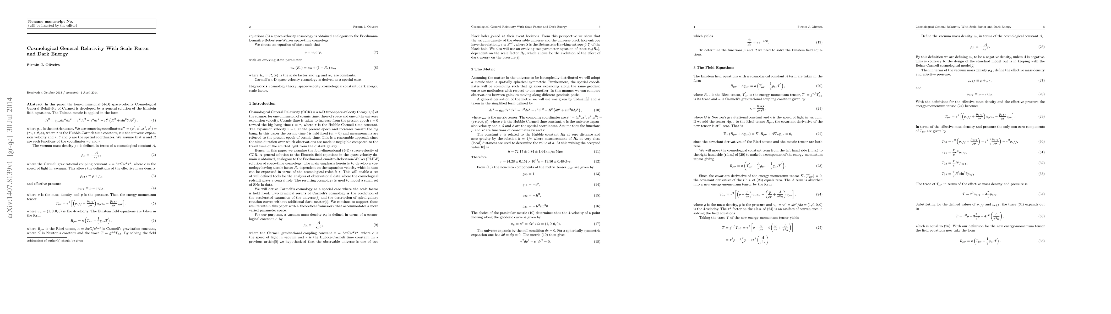 This paper develops a four-dimensional Cosmological General Relativity model incorporating a scale factor and evolving dark energy, solving the Einstein field equations in Tolman form. It provides redshift-distance relations and simulations for high redshift SNe Ia data, deriving the Carmeli cosmological model as a special case.