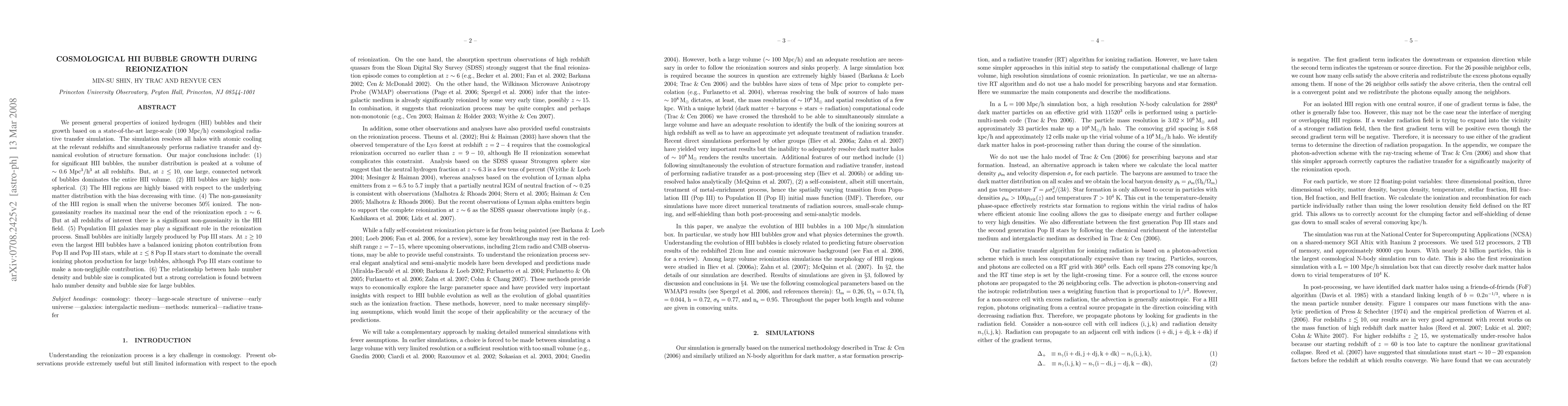 This paper investigates the growth and properties of ionized hydrogen (HII) bubbles during cosmic reionization using a high-resolution cosmological simulation. It finds that significant HII bubbles are non-spherical, biased towards matter distribution, and that Population III galaxies contribute significantly to early reionization.
