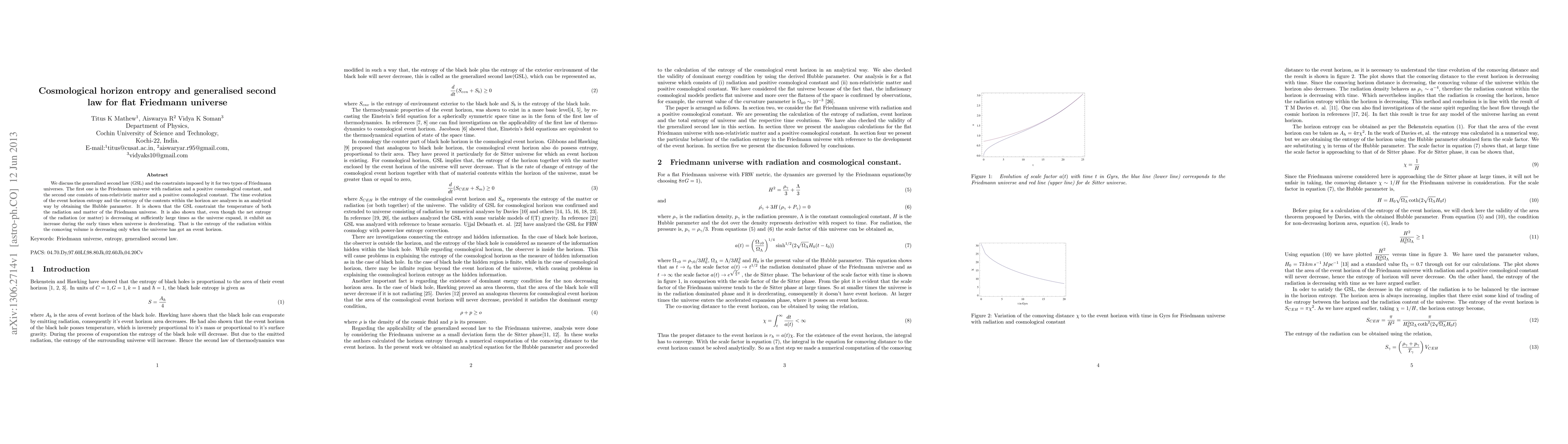 This research examines the generalized second law (GSL) in two types of flat Friedmann universes: one with radiation and a positive cosmological constant, and another with non-relativistic matter and a positive cosmological constant. It finds that the GSL constrains the temperature of both radiation and matter, showing entropy increases during early deceleration phases despite net entropy decreasing over time due to expansion.