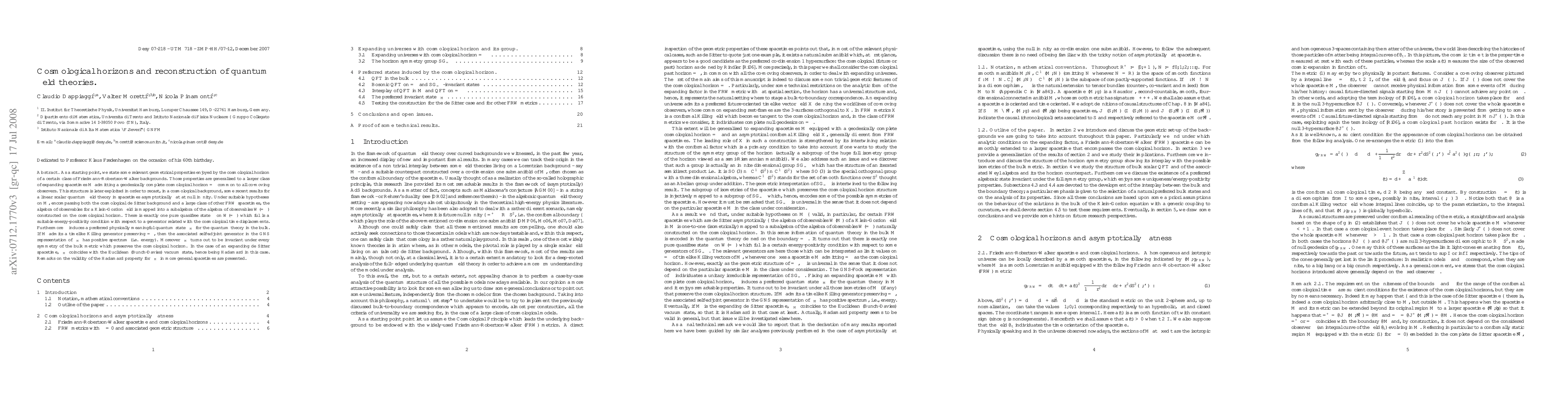 As a starting point, we state some relevant geometrical properties enjoyed by the cosmological horizon of a certain class of Friedmann-Robertson-Walker backgrounds. Those properties are generalised to a larger class of expanding spacetimes $M$ admitting a geodesically complete cosmological horizon $\scrim$ common to all co-moving observers. This structure is later exploited in order to recast, in a cosmological background, some recent results for a linear scalar quantum field theory in spacetimes asymptotically flat at null infinity. Under suitable hypotheses on $M$, encompassing both the cosmological de Sitter background and a large class of other FRW spacetimes, the algebra of observables for a Klein-Gordon field is mapped into a subalgebra of the algebra of observables $\cW(\scrim)$ constructed on the cosmological horizon. There is exactly one pure quasifree state $\lambda$ on $\cW(\scrim)$ which fulfils a suitable energy-positivity condition with respect to a generator related with the cosmological time displacements. Furthermore $\lambda$ induces a preferred physically meaningful quantum state $\lambda_M$ for the quantum theory in the bulk. If $M$ admits a timelike Killing generator preserving $\scrim$, then the associated self-adjoint generator in the GNS representation of $\lambda_M$ has positive spectrum (i.e. energy). Moreover $\lambda_M$ turns out to be invariant under every symmetry of the bulk metric which preserves the cosmological horizon. In the case of an expanding de Sitter spacetime, $\lambda_M$ coincides with the Euclidean (Bunch-Davies) vacuum state, hence being Hadamard in this case. Remarks on the validity of the Hadamard property for $\lambda_M$ in more general spacetimes are presented.