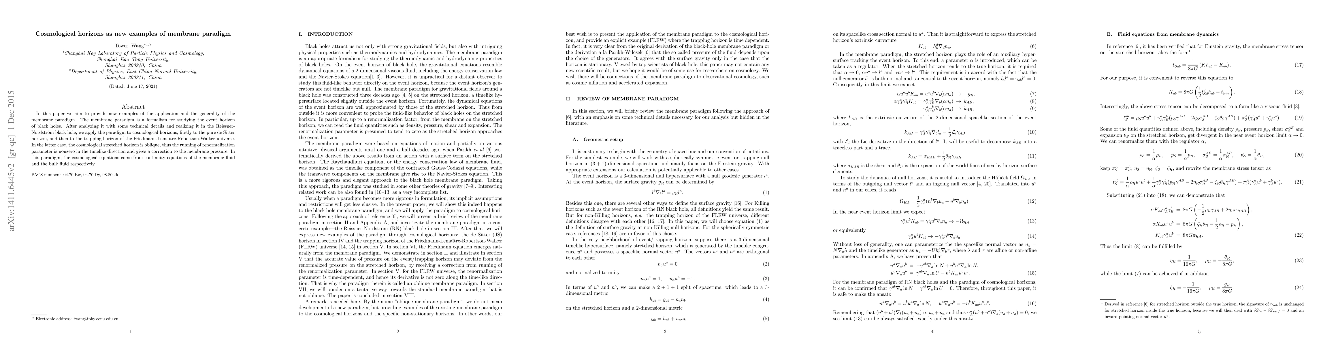 In this paper we aim to provide new examples of the application and the generality of the membrane paradigm. The membrane paradigm is a formalism for studying the event horizon of black holes. After analyzing it with some technical details and realizing it in the Reissner-Nordstrom black hole, we apply the paradigm to cosmological horizons, firstly to the pure de Sitter horizon, and then to the trapping horizon of the Friedmann-Lemaitre-Robertson-Walker universe. In the latter case, the cosmological stretched horizon is oblique, thus the running of renormalization parameter is nonzero in the timelike direction and gives a correction to the membrane pressure. In this paradigm, the cosmological equations come from continuity equations of the membrane fluid and the bulk fluid respectively.
