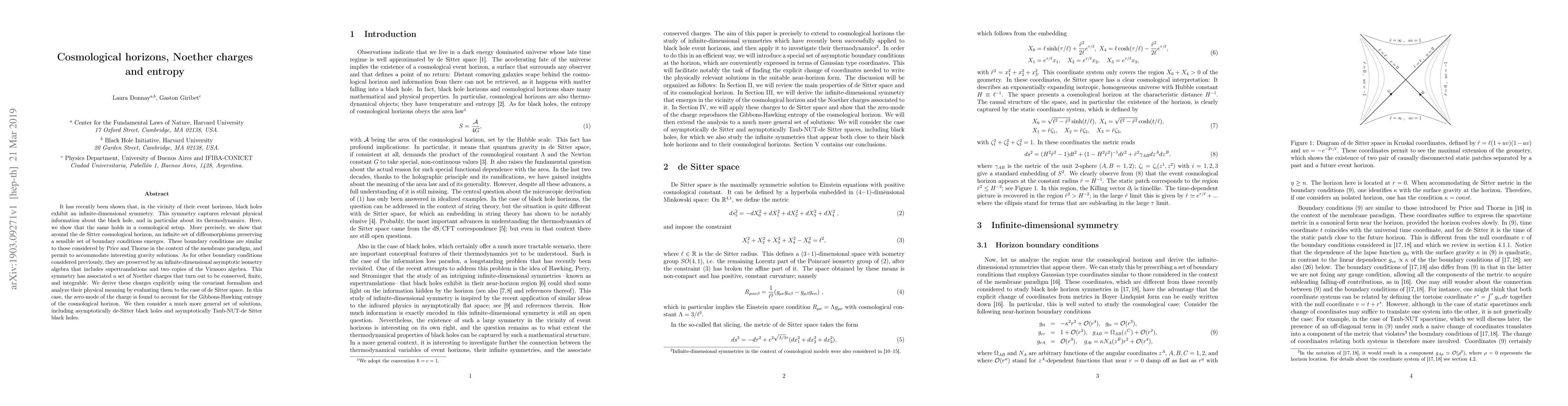It has recently been shown that, in the vicinity of their event horizons, black holes exhibit an infinite-dimensional symmetry. This symmetry captures relevant physical information about the black hole, and in particular about its thermodynamics. Here, we show that the same holds in a cosmological setup. More precisely, we show that around the de Sitter cosmological horizon, an infinite set of diffeomorphisms preserving a sensible set of boundary conditions emerges. These boundary conditions are similar to those considered by Price and Thorne in the context of the membrane paradigm, and permit to accommodate interesting gravity solutions. As for other boundary conditions considered previously, they are preserved by an infinite-dimensional asymptotic isometry algebra that includes supertranslations and two copies of the Virasoro algebra. This symmetry has associated a set of Noether charges that turn out to be conserved, finite, and integrable. We derive these charges explicitly using the covariant formalism and analyze their physical meaning by evaluating them to the case of de Sitter space. In this case, the zero-mode of the charge is found to account for the Gibbons-Hawking entropy of the cosmological horizon. We then consider a much more general set of solutions, including asymptotically de-Sitter black holes and asymptotically Taub-NUT-de Sitter black holes.