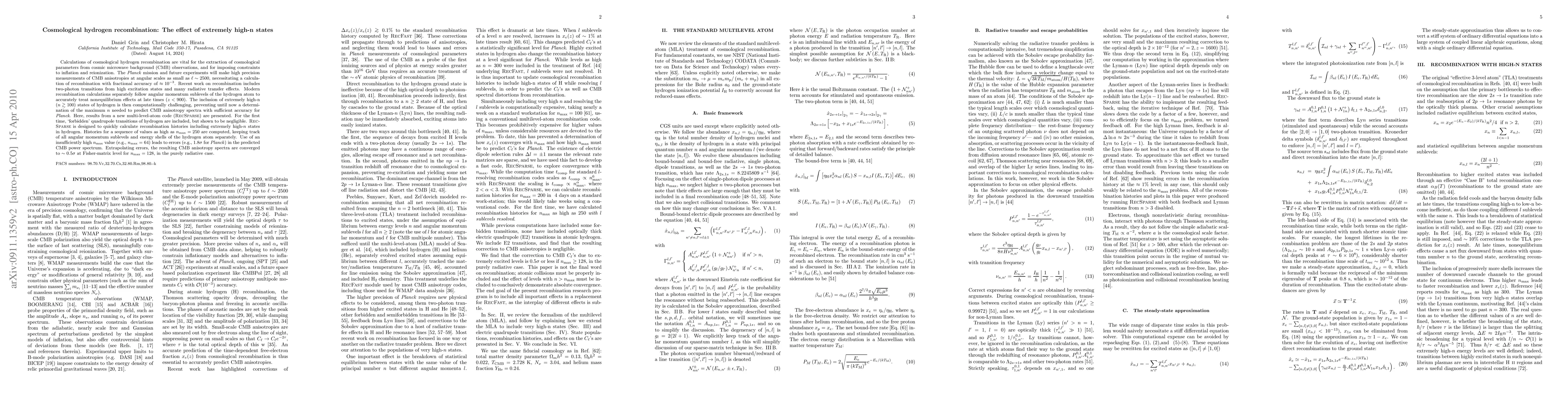 Calculations of cosmological hydrogen recombination are vital for the extraction of cosmological parameters from cosmic microwave background (CMB) observations, and for imposing constraints to inflation and re-ionization. The Planck} mission and future experiments will make high precision measurements of CMB anisotropies at angular scales as small as l~2500, necessitating a calculation of recombination with fractional accuracy of ~10^{-3}. Recent work on recombination includes two-photon transitions from high excitation states and many radiative transfer effects. Modern recombination calculations separately follow angular momentum sublevels of the hydrogen atom to accurately treat non-equilibrium effects at late times (z<900). The inclusion of extremely high-n (n>100) states of hydrogen is then computationally challenging, preventing until now a determination of the maximum n needed to predict CMB anisotropy spectra with sufficient accuracy for Planck. Here, results from a new multi-level-atom code (RecSparse) are presented. For the first time, `forbidden' quadrupole transitions of hydrogen are included, but shown to be negligible. RecSparse is designed to quickly calculate recombination histories including extremely high-n states in hydrogen. Histories for a sequence of values as high as n_max=250 are computed, keeping track of all angular momentum sublevels and energy shells of the hydrogen atom separately. Use of an insufficiently high n_max value (e.g., n_max=64) leads to errors (e.g., 1.8 sigma for Planck) in the predicted CMB power spectrum. Extrapolating errors, the resulting CMB anisotropy spectra are converged to 0.5 sigma at Fisher-matrix level for n_max=128, in the purely radiative case.