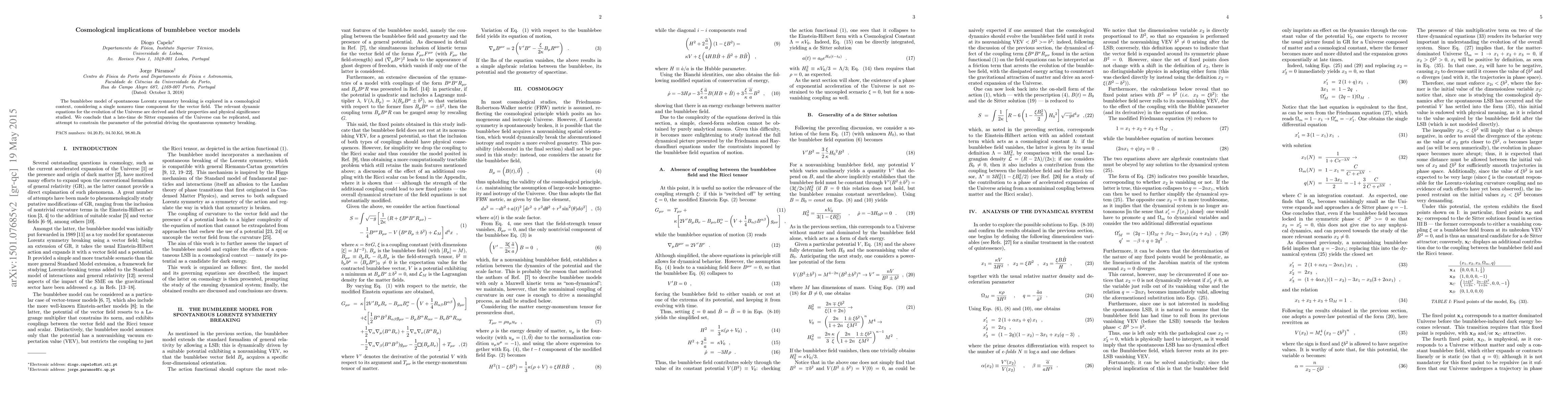 The Bumblebee Model, which breaks Lorentz symmetry through a non-zero time component vector field, is analyzed in a cosmological setting to replicate late-time de Sitter expansion. Parameter constraints for the potential driving this symmetry breaking are derived and discussed.
