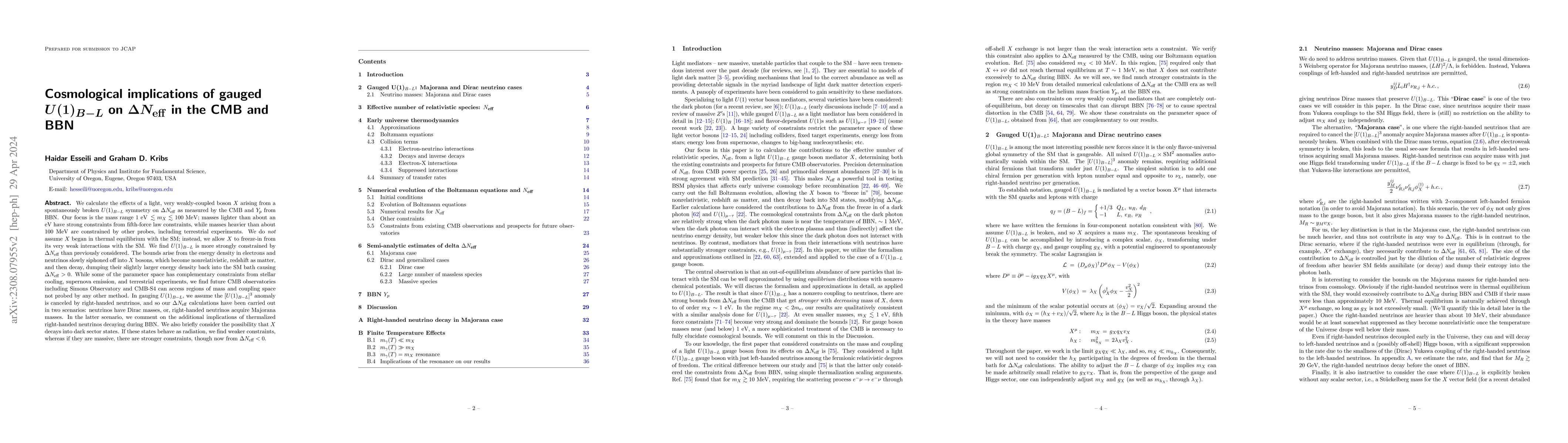 This paper examines the cosmological implications of a gauged $U(1)_{B-L}$ symmetry through the effects on $\Delta N_{\rm eff}$ in the CMB and $Y_p$ from Big Bang Nucleosynthesis (BBN). The study finds that $U(1)_{B-L}$ is more strongly constrained by $\Delta N_{\rm eff}$ due to energy density shifts into nonrelativistic $X$ bosons that decay, affecting the effective number of neutrino species. Future CMB observatories may reveal unexplored regions of mass and coupling space.