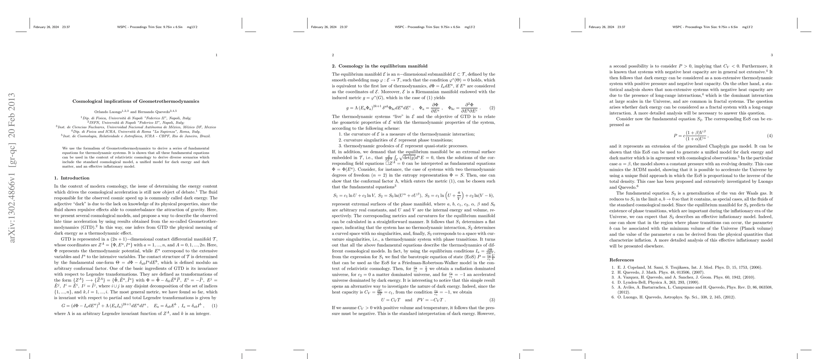 This paper employs Geometrothermodynamics to derive fundamental thermodynamic equations, which are then applied in relativistic cosmology to explore scenarios including the standard cosmological model, a unified dark energy-dark matter model, and an effective inflationary model.