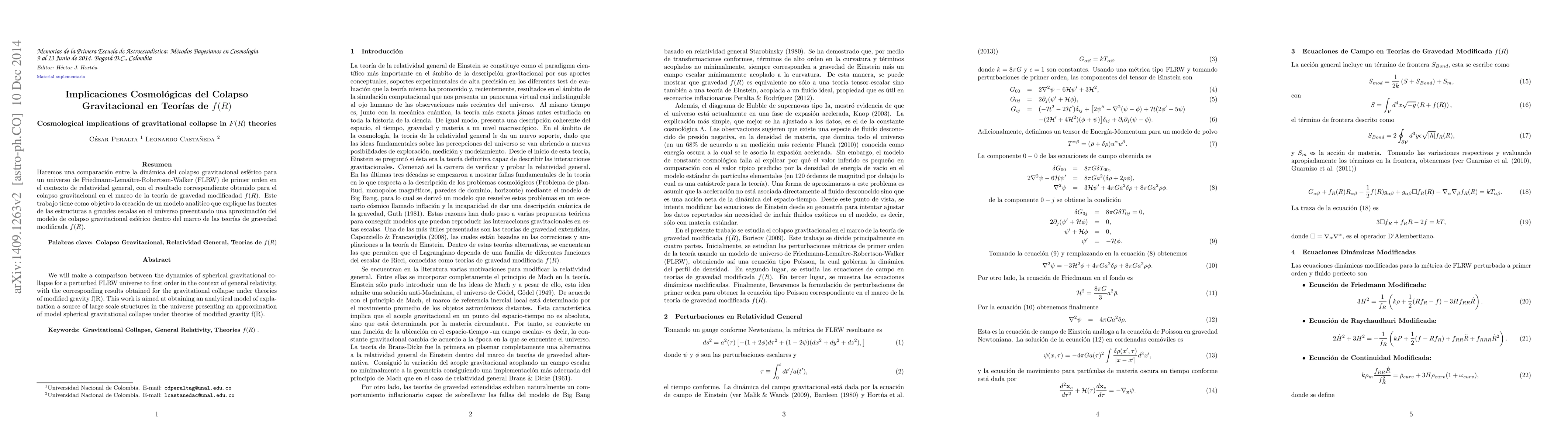 We will make a comparison between the dynamics of spherical gravitational collapse for a perturbed FLRW universe to first order in the context of general relativity, with the corresponding results obtained for the gravitational collapse under theories of modified gravity f(R). This work is aimed at obtaining an analytical model of explanation a source of large scale structures in the universe presenting an approximation of model spherical gravitational collapse under theories of modified gravity f(R).