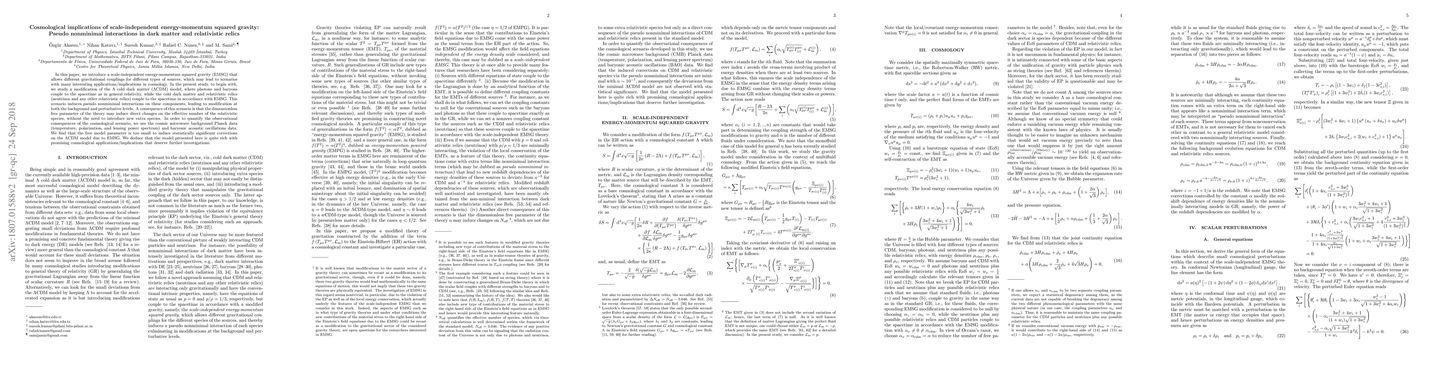 In this paper, we introduce a scale-independent energy-momentum squared gravity (EMSG) that allows different gravitational couplings for different types of sources, which may lead to scenarios with many interesting applications/implications in cosmology. In the present study, to begin with, we study a modification of the $\Lambda$ cold dark matter ($\Lambda$CDM) model, where photons and baryons couple to the spacetime as in general relativity, while the cold dark matter and relativistic relics (neutrinos and any other relativistic relics) couple to the spacetime in accordance with EMSG. This scenario induces pseudo nonminimal interactions on these components, leading to modification at both the background and perturbative levels. A consequence of this scenario is that the dimensionless free parameter of the theory may induce direct changes on the effective number of the relativistic species, without the need to introduce new extra species. In order to quantify the observational consequences of the cosmological scenario, we use the cosmic microwave background Planck data (temperature, polarization, and lensing power spectrum) and baryonic acoustic oscillations data. We find that the free model parameter is too small to induce statistically significant corrections on the $\Lambda$CDM model due to EMSG. We deduce that the model presented here is quite rich with promising cosmological applications/implications that deserve further investigations.