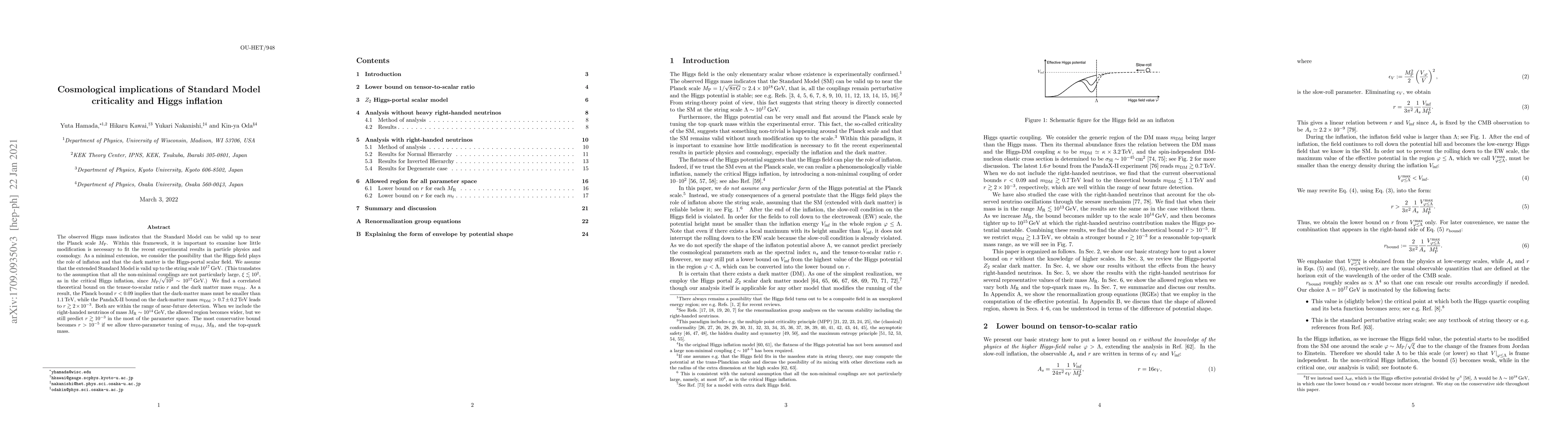 The observed Higgs mass indicates that the Standard Model can be valid up to near the Planck scale $M_\text{P}$. Within this framework, it is important to examine how little modification is necessary to fit the recent experimental results in particle physics and cosmology. As a minimal extension, we consider the possibility that the Higgs field plays the role of inflaton and that the dark matter is the Higgs-portal scalar field. We assume that the extended Standard Model is valid up to the string scale $10^{17}\,\text{GeV}$. (This translates to the assumption that all the non-minimal couplings are not particularly large, $\xi\lesssim 10^2$, as in the critical Higgs inflation, since $M_\text{P}/\sqrt{10^2}\sim 10^{17}\,\text{GeV}$.) We find a correlated theoretical bound on the tensor-to-scalar ratio $r$ and the dark matter mass $m_\text{DM}$. As a result, the Planck bound $r<0.09$ implies that the dark-matter mass must be smaller than 1.1\,TeV, while the PandaX-II bound on the dark-matter mass $m_\text{DM}>0.7\pm0.2\,\text{TeV}$ leads to $r\gtrsim 2\times10^{-3}$. Both are within the range of near-future detection. When we include the right-handed neutrinos of mass $M_\text{R}\sim 10^{14}$\,GeV, the allowed region becomes wider, but we still predict $r\gtrsim 10^{-3}$ in the most of the parameter space. The most conservative bound becomes $r>10^{-5}$ if we allow three-parameter tuning of $m_\text{DM}$, $M_\text{R}$, and the top-quark mass.