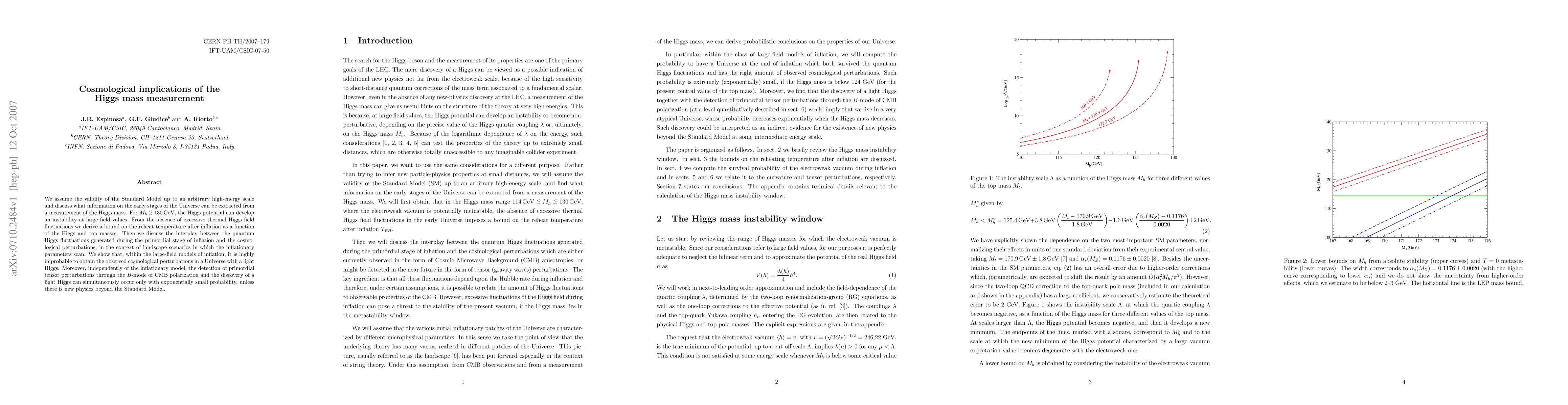 We assume the validity of the Standard Model up to an arbitrary high-energy scale and discuss what information on the early stages of the Universe can be extracted from a measurement of the Higgs mass. For Mh < 130 GeV, the Higgs potential can develop an instability at large field values. From the absence of excessive thermal Higgs field fluctuations we derive a bound on the reheat temperature after inflation as a function of the Higgs and top masses. Then we discuss the interplay between the quantum Higgs fluctuations generated during the primordial stage of inflation and the cosmological perturbations, in the context of landscape scenarios in which the inflationary parameters scan. We show that, within the large-field models of inflation, it is highly improbable to obtain the observed cosmological perturbations in a Universe with a light Higgs. Moreover, independently of the inflationary model, the detection of primordial tensor perturbations through the B-mode of CMB polarization and the discovery of a light Higgs can simultaneously occur only with exponentially small probability, unless there is new physics beyond the Standard Model.