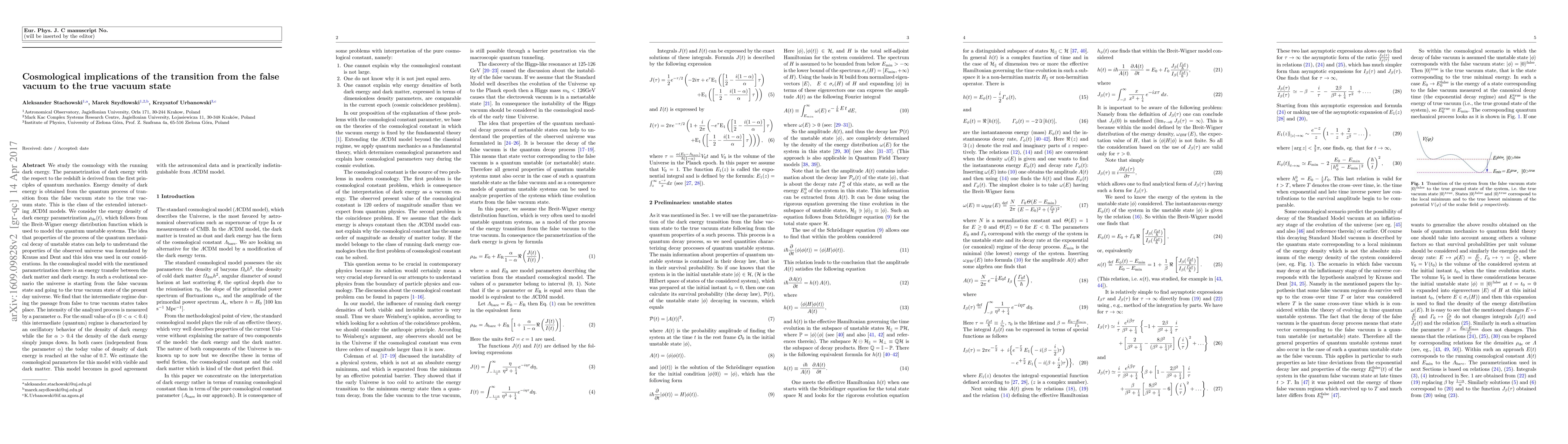 We study the cosmology with the running dark energy. The parametrization of dark energy with the respect to the redshift is derived from the first principles of quantum mechanics. Energy density of dark energy is obtained from the quantum process of transition from the false vacuum state to the true vacuum state. This is the class of the extended interacting $\Lambda$CDM models. We consider the energy density of dark energy parametrization $\rho_\text{de}(t)$, which follows from the Breit-Wigner energy distribution function which is used to model the quantum unstable systems. The idea that properties of the process of the quantum mechanical decay of unstable states can help to understand the properties of the observed universe was formulated by Krauss and Dent and this idea was used in our considerations. In the cosmological model with the mentioned parametrization there is an energy transfer between the dark matter and dark energy. In such a evolutional scenario the universe is starting from the false vacuum state and going to the true vacuum state of the present day universe. We find that the intermediate regime during the passage from false to true vacuum states takes place. The intensity of the analyzed process is measured by a parameter $\alpha$. For the small value of $\alpha$ ($0<\alpha <0.4$) this intermediate (quantum) regime is characterized by an oscillatory behavior of the density of dark energy while the for $\alpha > 0.4$ the density of the dark energy simply jumps down. In both cases (independent from the parameter $\alpha$) the today value of density of dark energy is reached at the value of $0.7$. We estimate the cosmological parameters for this model with visible and dark matter. This model becomes in good agreement with the astronomical data and is practically indistinguishable from $\Lambda$CDM model.