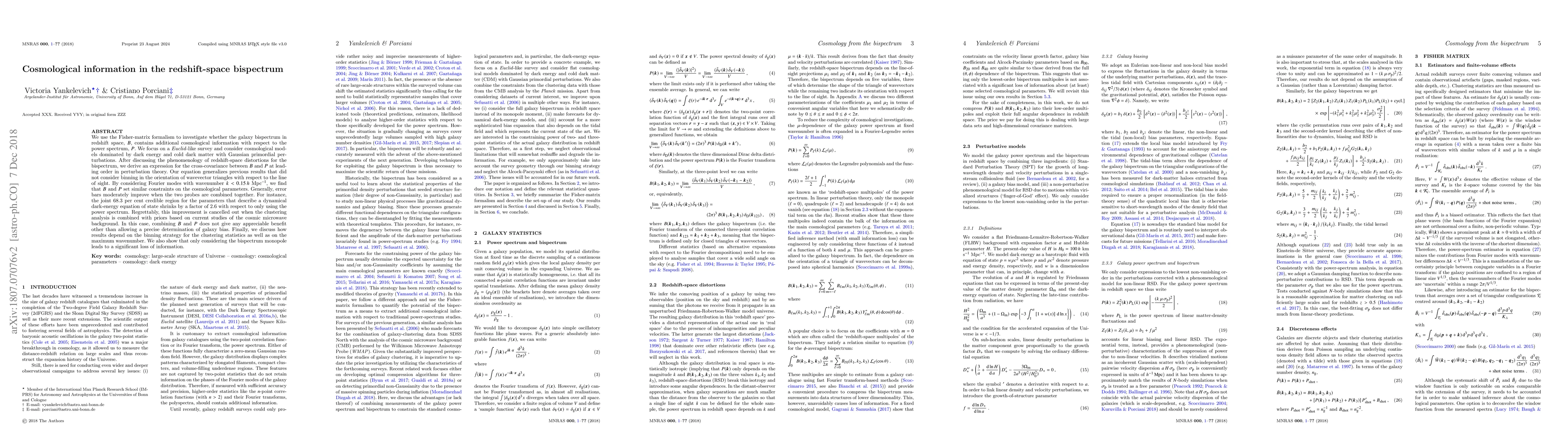 The galaxy bispectrum in redshift space provides similar constraints on cosmological parameters as the power spectrum alone, with combining them improving error bars moderately. However, adding the bispectrum does not yield significant benefits when combined with CMB priors or using a specific binning strategy.