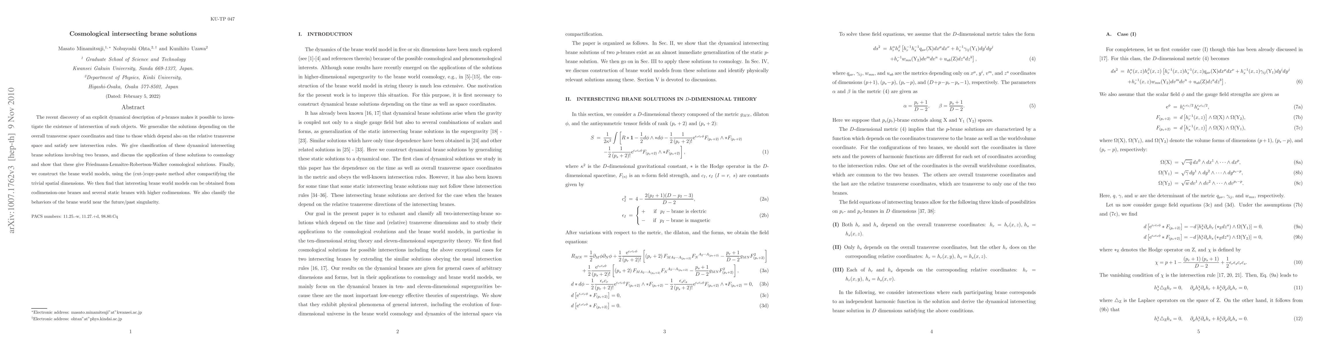 This paper explores the intersection of p-branes in cosmological models, presenting generalized solutions that depend on both overall and relative transverse space coordinates. It classifies dynamical intersecting brane solutions and applies them to derive Friedmann-Lemaitre-Robertson-Walker cosmological solutions, constructing brane world models using the copy-paste method.