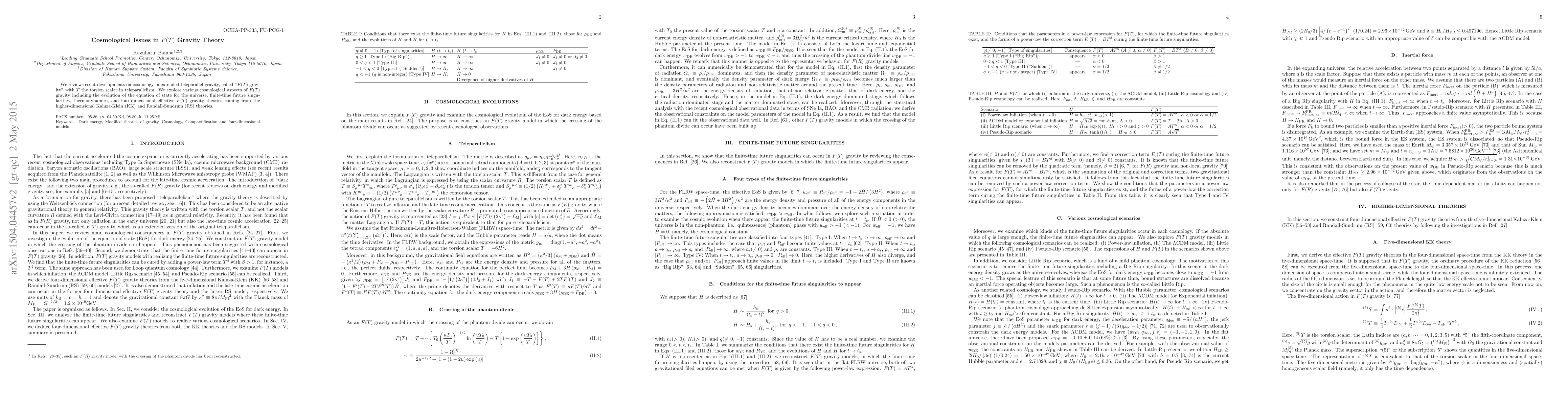 We review recent developments on cosmology in extended teleparallel gravity, called "$F(T)$ gravity" with $T$ the torsion scalar in teleparallelism. We explore various cosmological aspects of $F(T)$ gravity including the evolution of the equation of state for the universe, finite-time future singularities, thermodynamics, and four-dimensional effective $F(T)$ gravity theories coming from the higher-dimensional Kaluza-Klein (KK) and Randall-Sundrum (RS) theories.