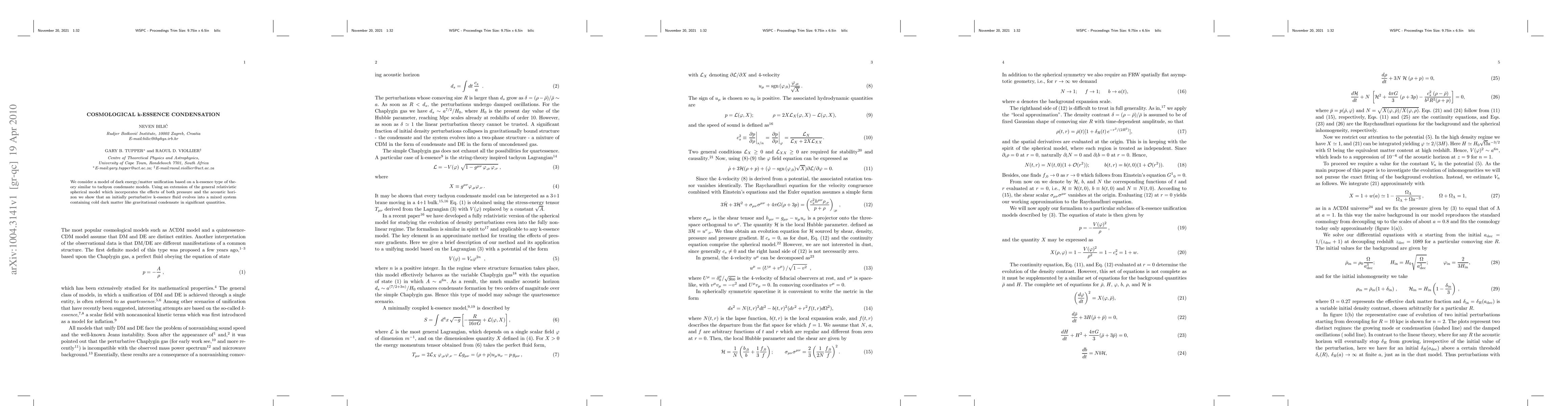 Researchers propose a model of dark energy/matter unification that suggests k-essence condensation can lead to significant amounts of cold dark matter-like gravitational condensate. The study uses a modified general relativistic spherical model to simulate the evolution of k-essence fluid into this mixed system.