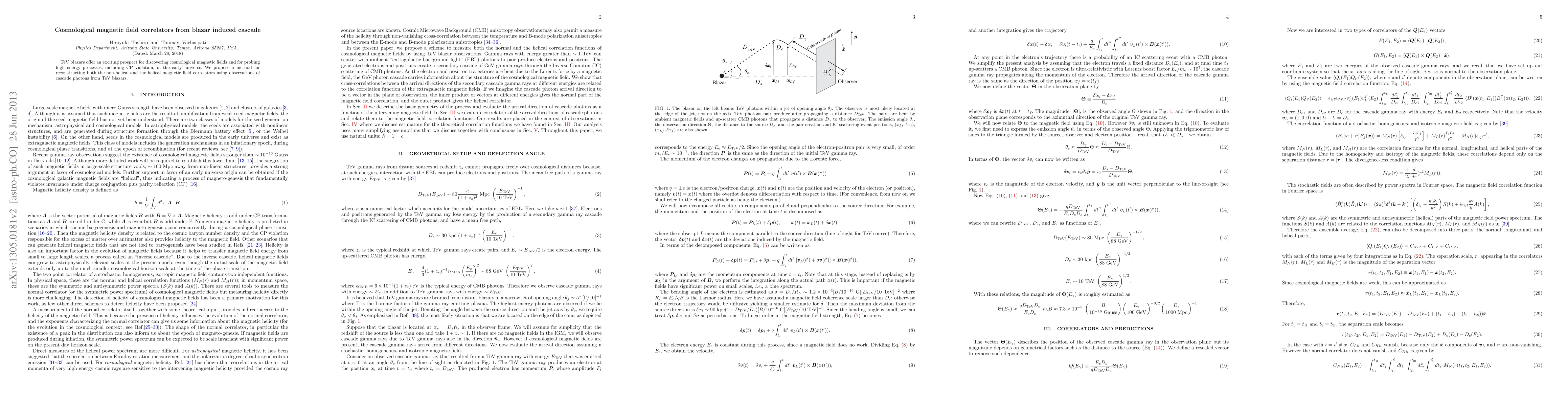 This paper proposes a method to reconstruct cosmological magnetic field correlators, including both non-helical and helical components, using cascade photons from TeV blazars, aiming to explore high-energy processes and CP violation in the early universe.