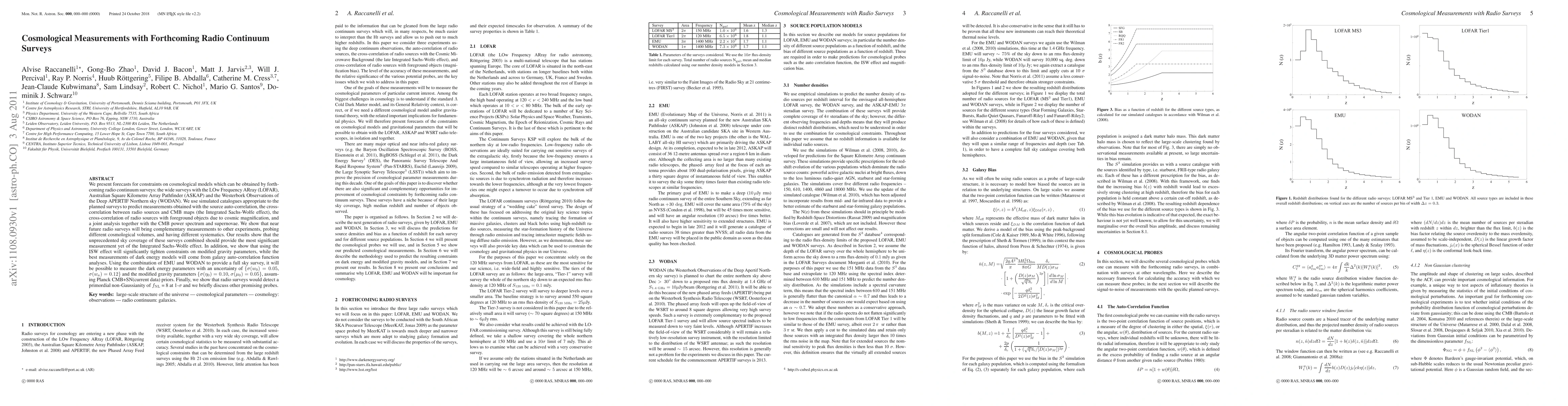 We present forecasts for constraints on cosmological models which can be obtained by forthcoming radio continuum surveys: the wide surveys with the LOw Frequency ARray (LOFAR), Australian Square Kilometre Array Pathfinder (ASKAP) and the Westerbork Observations of the Deep APERTIF Northern sky (WODAN). We use simulated catalogues appropriate to the planned surveys to predict measurements obtained with the source auto-correlation, the cross-correlation between radio sources and CMB maps (the Integrated Sachs-Wolfe effect), the cross-correlation of radio sources with foreground objects due to cosmic magnification, and a joint analysis together with the CMB power spectrum and supernovae. We show that near future radio surveys will bring complementary measurements to other experiments, probing different cosmological volumes, and having different systematics. Our results show that the unprecedented sky coverage of these surveys combined should provide the most significant measurement yet of the Integrated Sachs-Wolfe effect. In addition, we show that using the ISW effect will significantly tighten constraints on modified gravity parameters, while the best measurements of dark energy models will come from galaxy auto-correlation function analyses. Using the combination of EMU and WODAN to provide a full sky survey, it will be possible to measure the dark energy parameters with an uncertainty of \{$\sigma (w_0) = 0.05$, $\sigma (w_a) = 0.12$\} and the modified gravity parameters \{$\sigma (\eta_0) = 0.10$, $\sigma (\mu_0) = 0.05$\}, assuming Planck CMB+SN(current data) priors. Finally, we show that radio surveys would detect a primordial non-Gaussianity of $f_{\rm NL}$ = 8 at 1-$\sigma$ and we briefly discuss other promising probes.