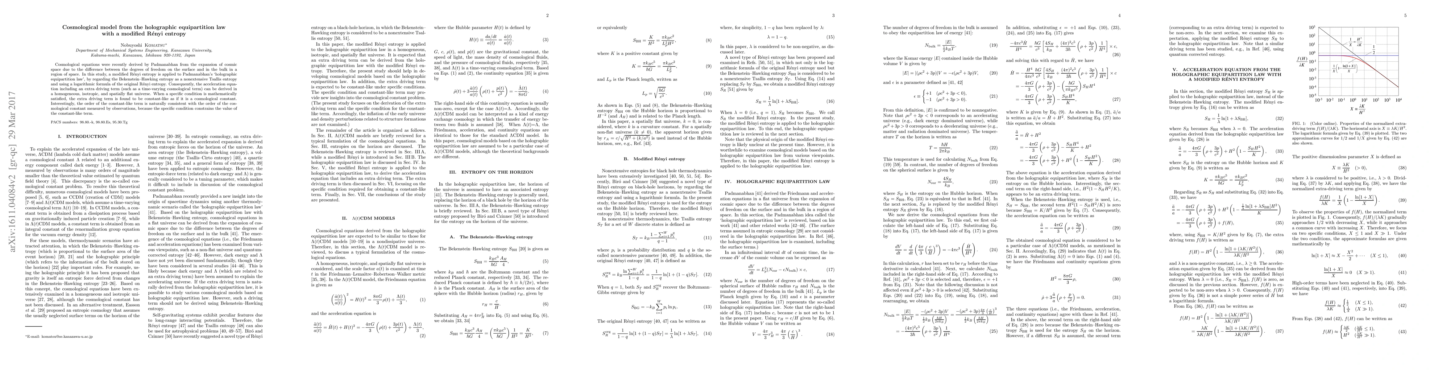 Cosmological equations were recently derived by Padmanabhan from the expansion of cosmic space due to the difference between the degrees of freedom on the surface and in the bulk in a region of space. In this study, a modified R\'{e}nyi entropy is applied to Padmanabhan's `holographic equipartition law', by regarding the Bekenstein--Hawking entropy as a nonextensive Tsallis entropy and using a logarithmic formula of the original R\'{e}nyi entropy. Consequently, the acceleration equation including an extra driving term (such as a time-varying cosmological term) can be derived in a homogeneous, isotropic, and spatially flat universe. When a specific condition is mathematically satisfied, the extra driving term is found to be constant-like as if it is a cosmological constant. Interestingly, the order of the constant-like term is naturally consistent with the order of the cosmological constant measured by observations, because the specific condition constrains the value of the constant-like term.