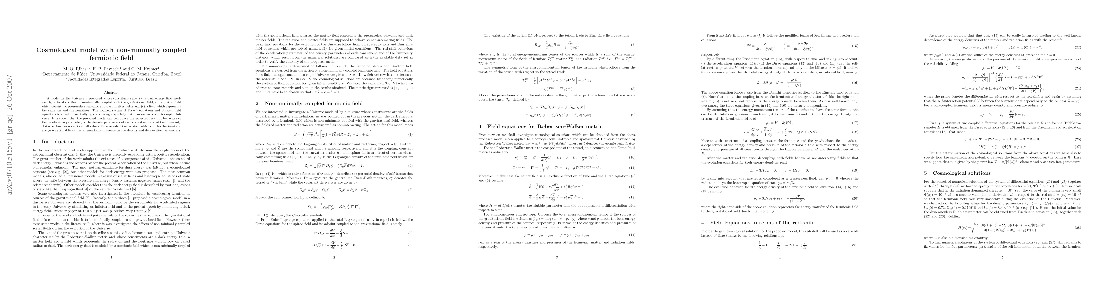 This research proposes a cosmological model featuring a dark energy field modeled by a non-minimally coupled fermionic field, alongside matter and radiation fields. Numerical solutions to the coupled Dirac and Einstein field equations demonstrate the model's ability to reproduce observed red-shift behaviors, with the coupling constant significantly influencing density and deceleration parameters at low red-shifts.