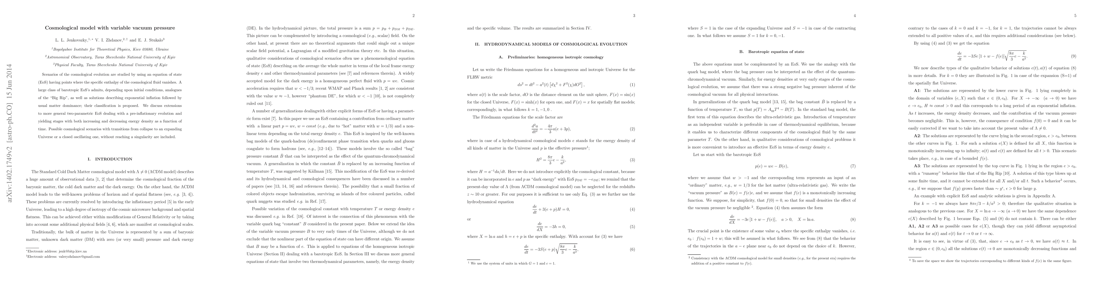 Scenarios of cosmological evolution having inflationary stages are studied by using equations of state (EoS) inspired by the quark bag model. A crucial point is the existence of states where the specific enthalpy of the cosmological fluid vanishes. A large class of barotropic EoS admits, depending upon initial conditions, for a concrete equation of state, analogs of the "Big Rip" as well as solutions describing an exponential inflation followed by the usual matter dominance. We found scalar field potentials that mimic the behavior of the cosmological scale factor in case of special EoS from the above class. Extensions to more general two-parametric EoS are discussed that describe a pre-inflationary evolution.