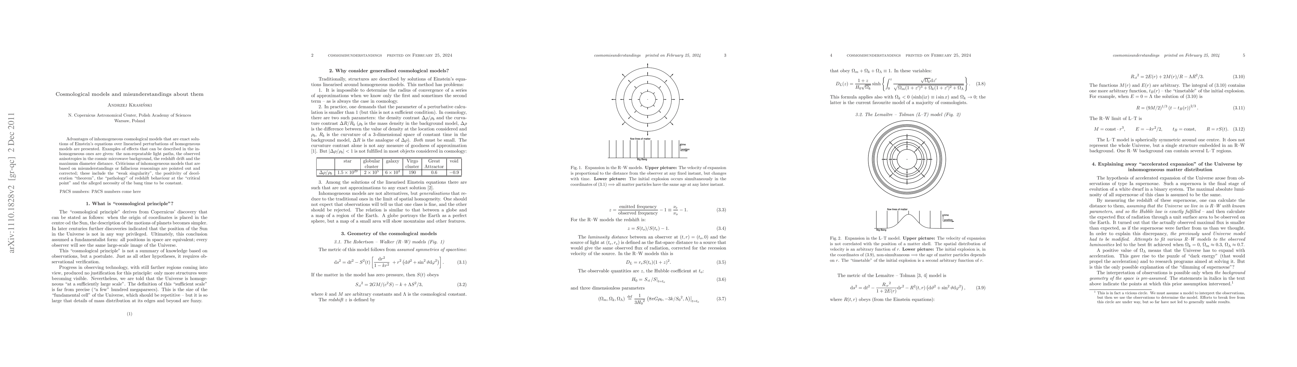 The paper highlights the superiority of inhomogeneous cosmological models, exact solutions of Einstein's equations, over linearized homogeneous models. It corrects common misconceptions, such as 'weak singularity' and 'redshift pathology', demonstrating their capability to explain phenomena like non-repeating light paths, CMB anisotropies, redshift drift, and maximum diameter distance.
