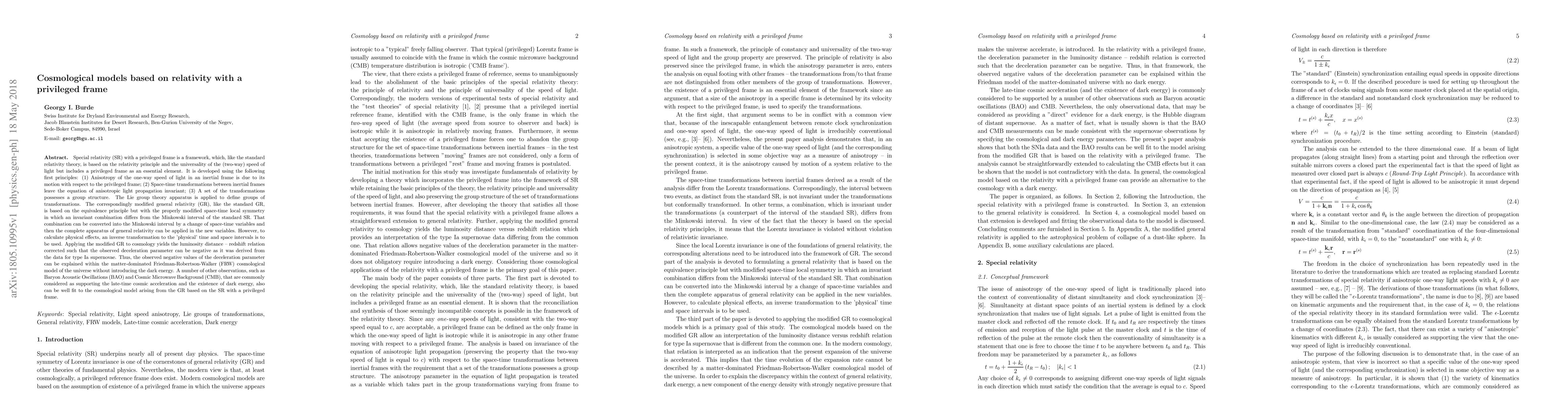This paper proposes a modified cosmological model based on relativity with a privileged frame, explaining the observed negative deceleration parameter without invoking dark energy. The model uses anisotropic light propagation and modified space-time transformations, fitting well with observations like type Ia supernovae, Baryon Acoustic Oscillations, and Cosmic Microwave Background data.