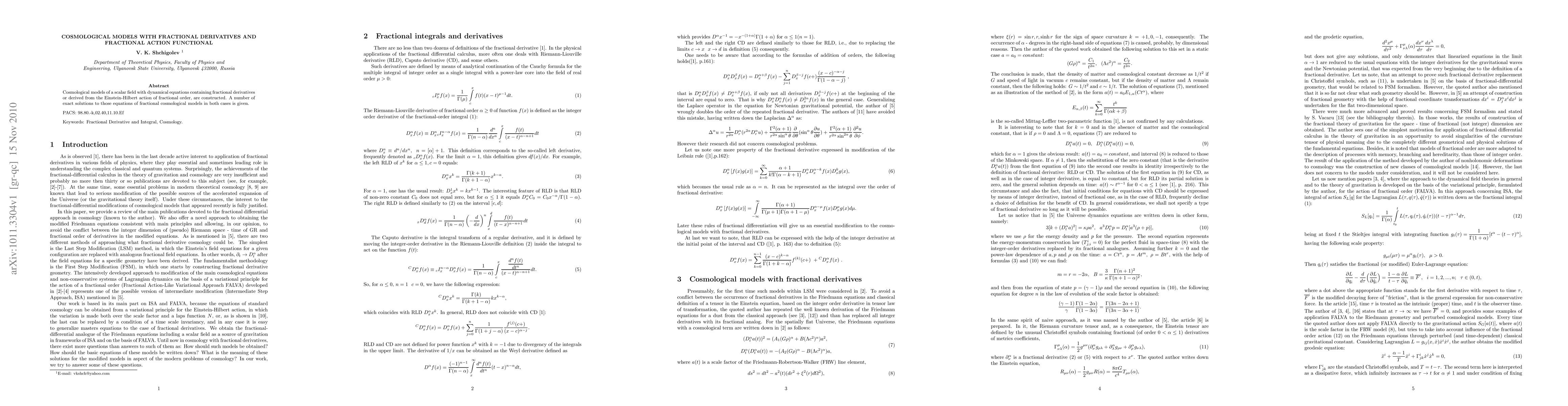 This paper constructs cosmological models incorporating fractional derivatives and fractional action functionals, deriving exact solutions to the resulting dynamical equations for scalar field cosmology. The study explores both fractional derivative-based and fractional action-derived models.