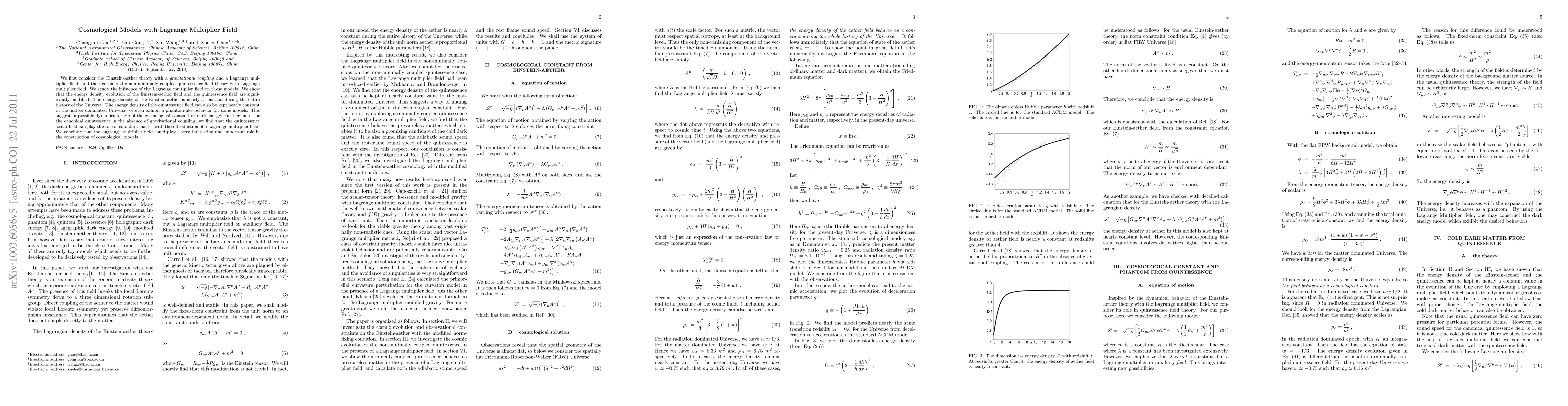 This paper explores cosmological models incorporating a Lagrange multiplier field within Einstein-aether and quintessence theories, demonstrating significant modifications to their energy density evolution. The study suggests that the Lagrange multiplier field may dynamically influence the cosmological constant or dark energy, and can even enable quintessence to act as cold dark matter.