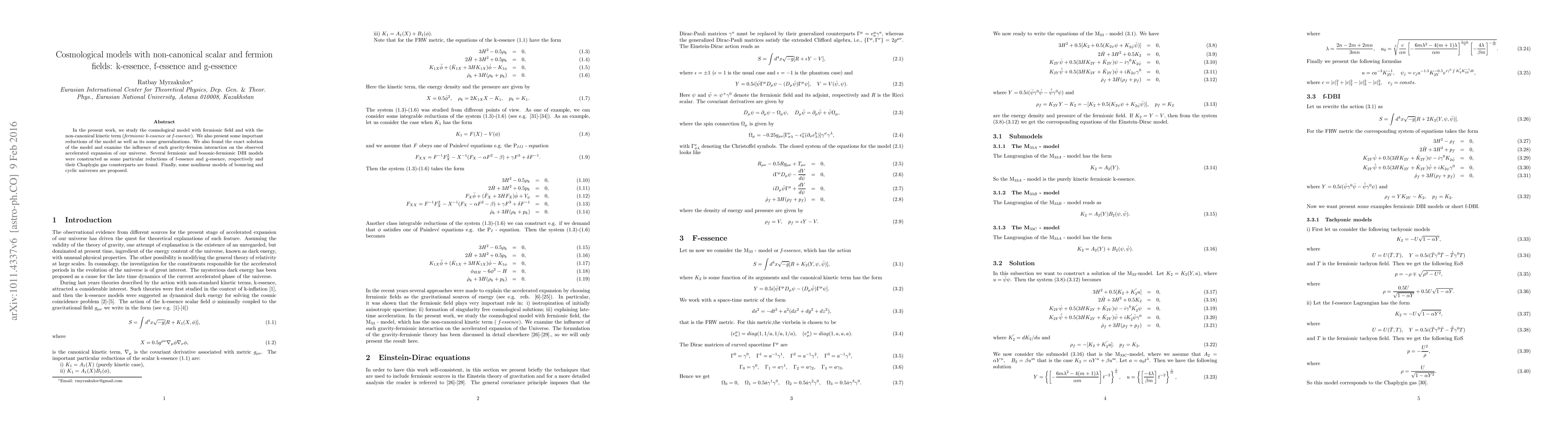 This paper explores cosmological models incorporating non-canonical kinetic terms in fermionic fields (f-essence) and their generalizations, including k-essence and g-essence. It presents exact solutions and examines their impact on the universe's accelerated expansion, alongside constructing DBI models and proposing nonlinear models for bouncing and cyclic universes.